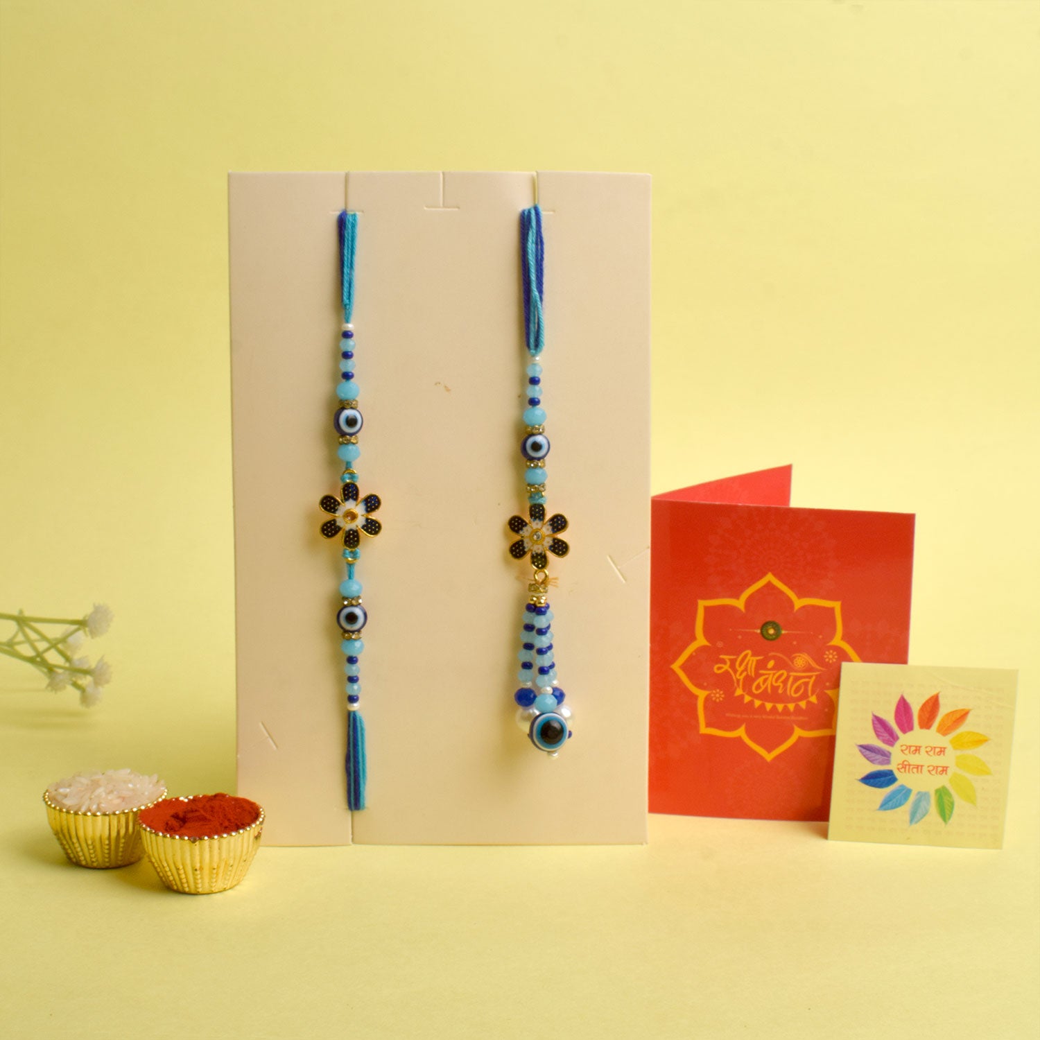 • Package: 1 Men Rakhi, 1 Women Lumba Rakhi, Roli Chawal Pack, Ram & Sita Theme Stickers