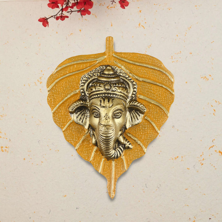 Ganesh wall hanging | Ganesh face on leaf | Leaf patta Ganesh decor | Lord Ganesha wall art | Spiritual wall hanging | Decorative Ganesh idol | Hindu god wall decor | Ganesh face decor | Traditional wall hanging |