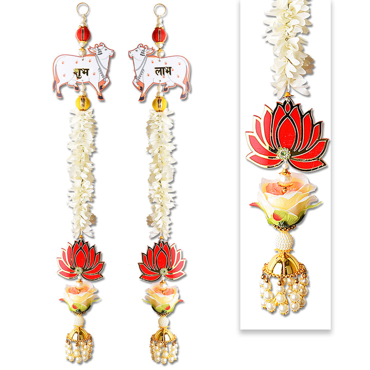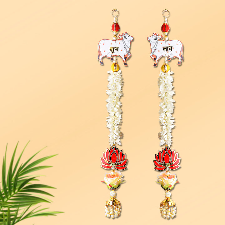 cow shubh labh hanging | auspicious side wall décor | acrylic cow wall hanging | pooja door décor | festive Indian wall art | navratri door decoration | gopashtami décor | traditional Indian toran | beads and mirror hanging | handmade shubh labh toran