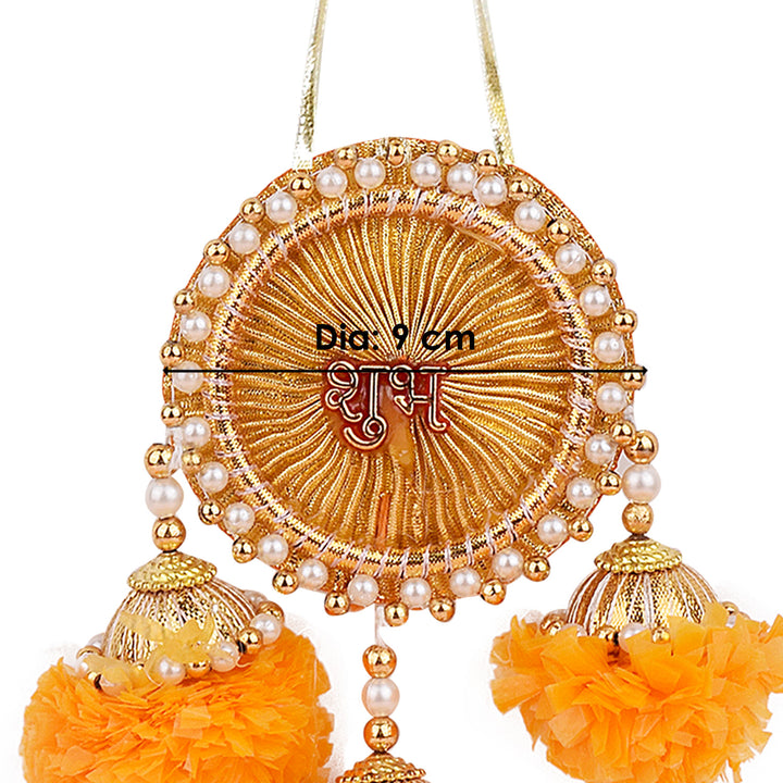 shubh labh wall hanging | artificial marigold door décor | festive Indian decoration | side door pooja décor | beads wall toran | traditional shubh labh latkans | diwali home decoration | handmade spiritual wall hangings | navratri décor items | marigold wall décor