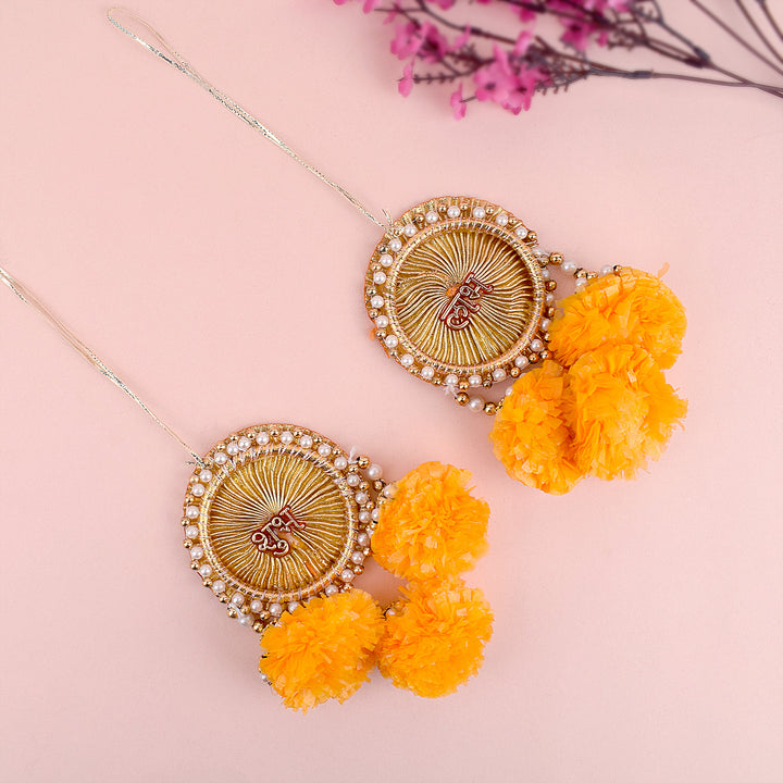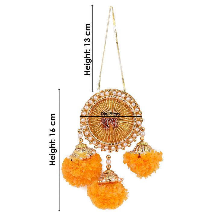 Decorate your space with blessings using this Beads Shubh Labh Side Door Wall Hanging set. Made with decorative beads, goti, and artificial marigold flowers, this pair brings vibrant energy and a traditional touch to your home.