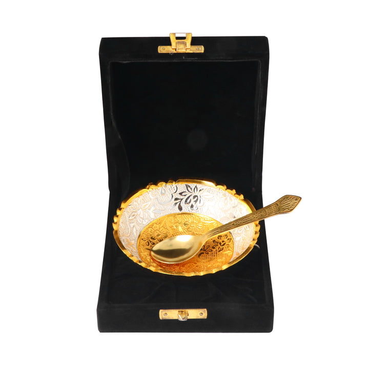About Product: Satvik Presents Gifts for all Occasions. Satvik Presents Royal Wedding Diwali Housewarming Gift Set which comes with Unique Royal Velvet Box Premium Gift Packing Set. The Bowl Set is made of Aluminum with Gold Silver Plated, This Bowl Set has eye-catching accents on its exterior. Sporting a silver finish, this Bowl Set makes a wonderful gift for Friends, Family, Corporate Gifting, Colleagues, and Business gifts. Christmas Gift, Perfect Gift.