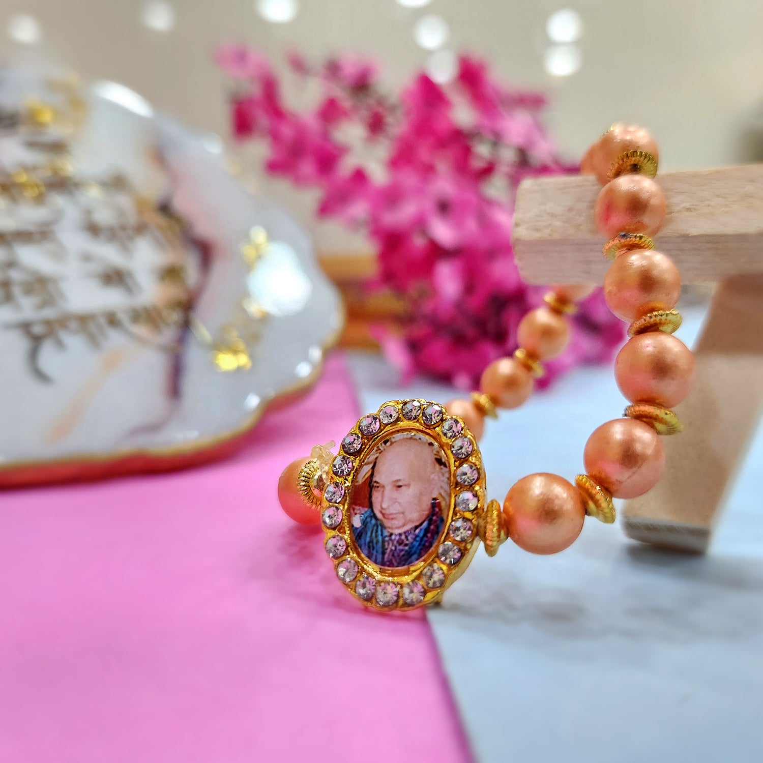 • Item Name: Orange Round Pearl Bracelet with Jai Guruji Swaroop Handmade Bracelets for Men and Women