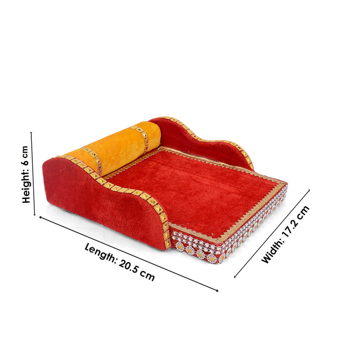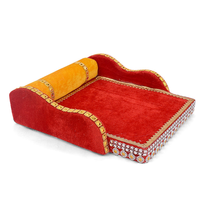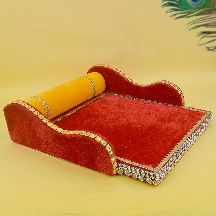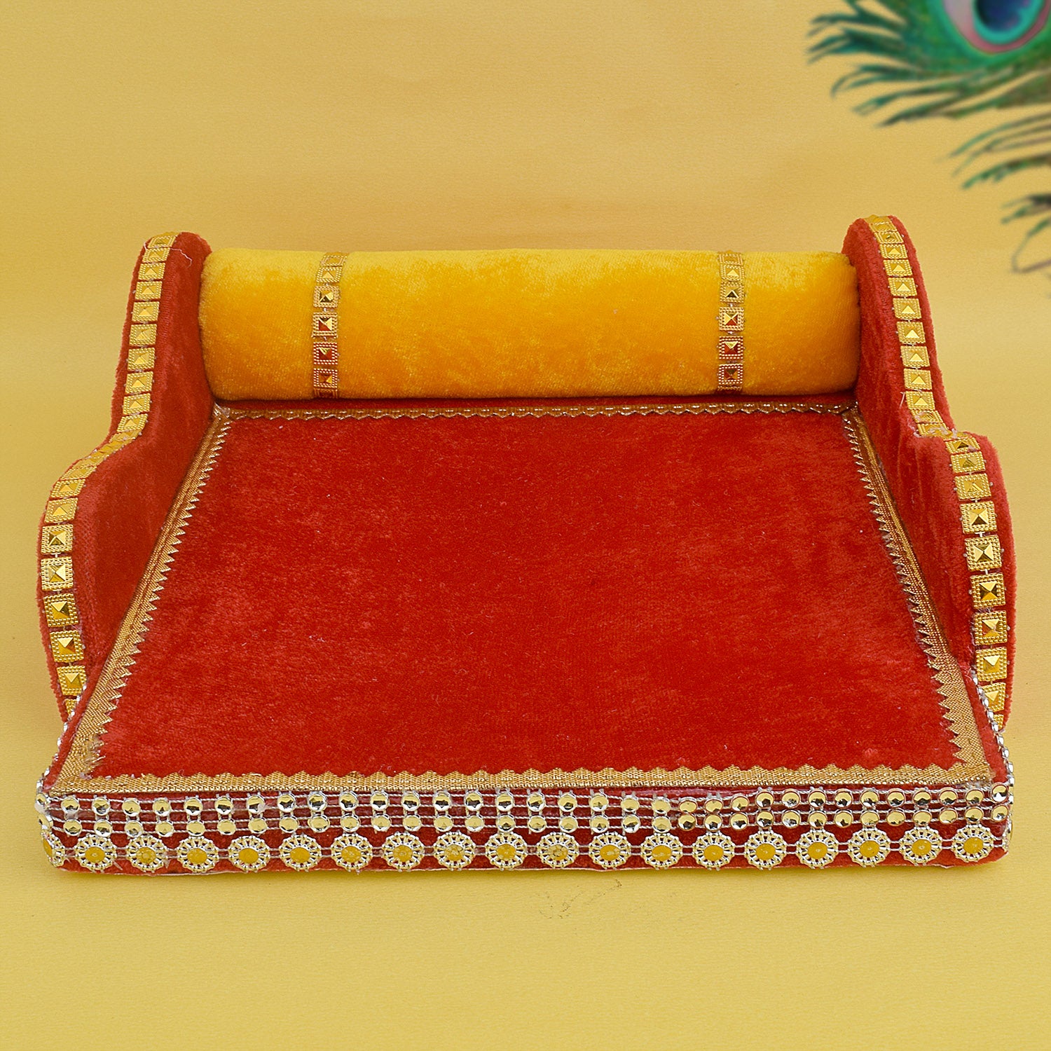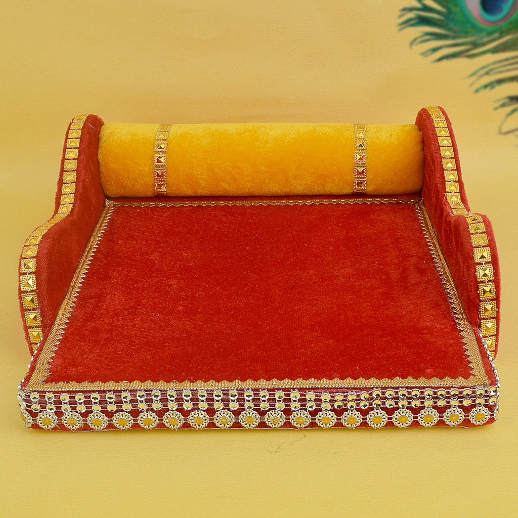 laddu gopal velvet bed | medium krishna sleeping bed | pooja bed for laddu gopal | red velvet deity bed | traditional kanha ji bed | gopal ji velvet bedding | medium size bal gopal bed | mdf velvet deity seat | divine krishna pooja accessories | soft velvet laddu gopal throne | spiritual krishna bed | handmade deity furniture