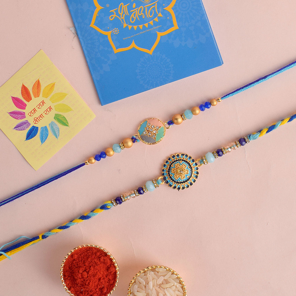 Meenakari Rakhi Set of 2: Adorned with intricate Meenakari work, these rakhis exude the essence of cultural heritage and artistic finesse. The vibrant colors and delicate patterns make these rakhis a true celebration of sibling love.