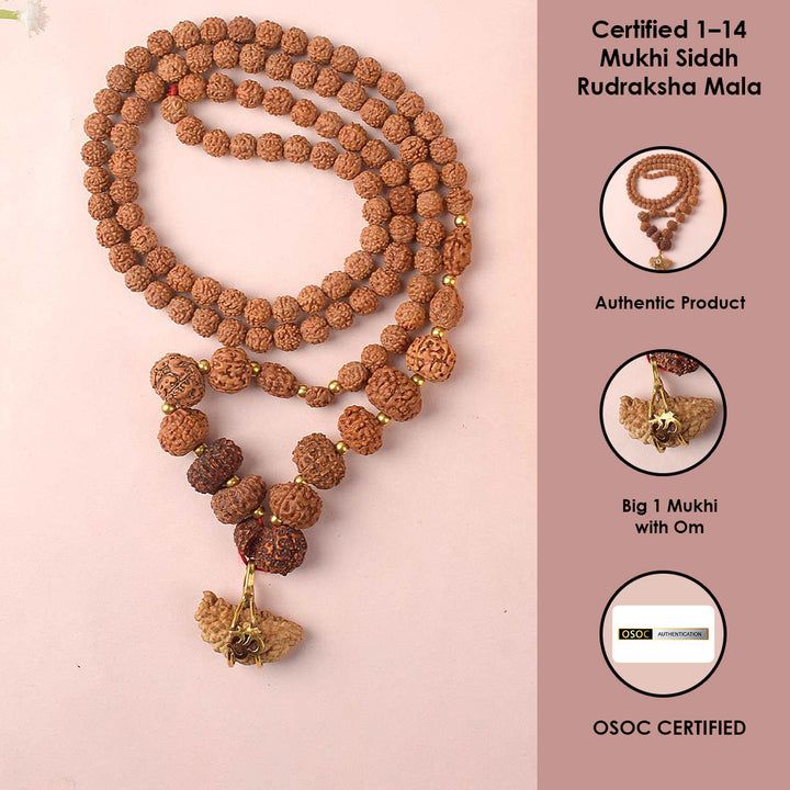 100% Original & Certified 1–14 Mukhi Siddh Rudraksha Mala with Big 1 Mukhi