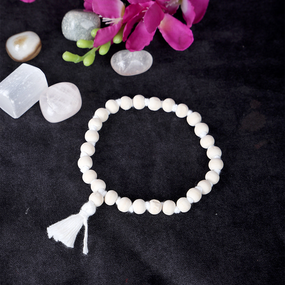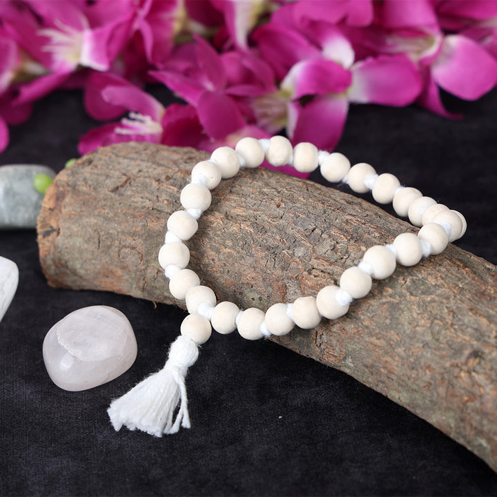 • Material : Made from High Quality Tulsi Beads to maintain the purity of Jaap Mala The beads is woven in White Cotton Thread, A colored Fringe is also joint in the Mala.