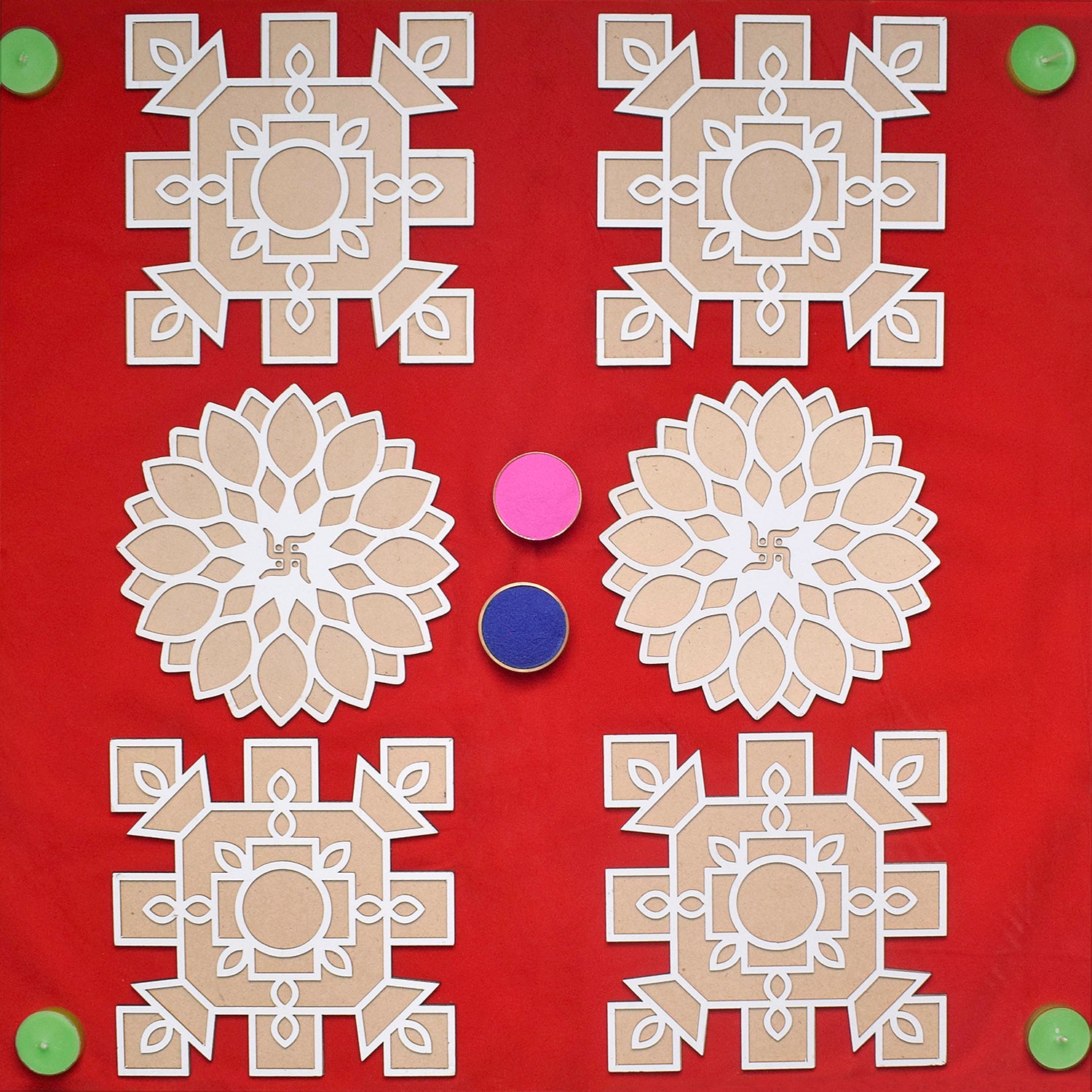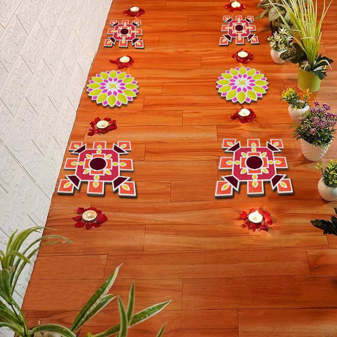 • Durable Materials: Crafted from wooden tools, the mat is built to last, ensuring you can use it for many Diwalis to come. Endless Design Possibilities: Explore an array of designs, from traditional kolam patterns to modern floral and border designs, with our versatile stencils.