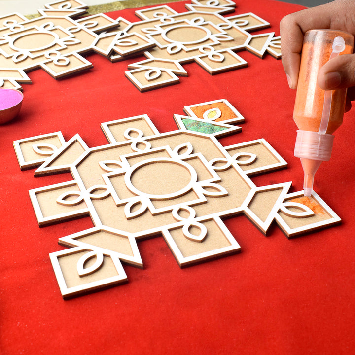 • Material & Size: Portable Rangoli crafted from MDF material not flexible like any other so that you can easily move even filled rangoli here and there. They are available in four exquisite designs, each measuring 8 inches.