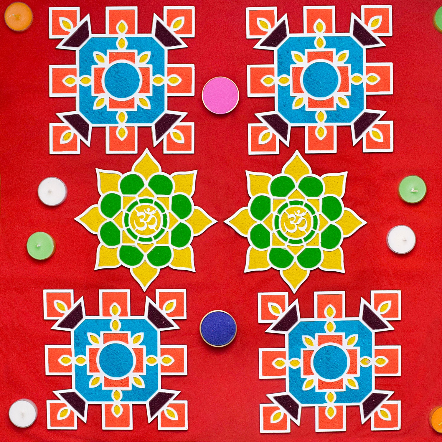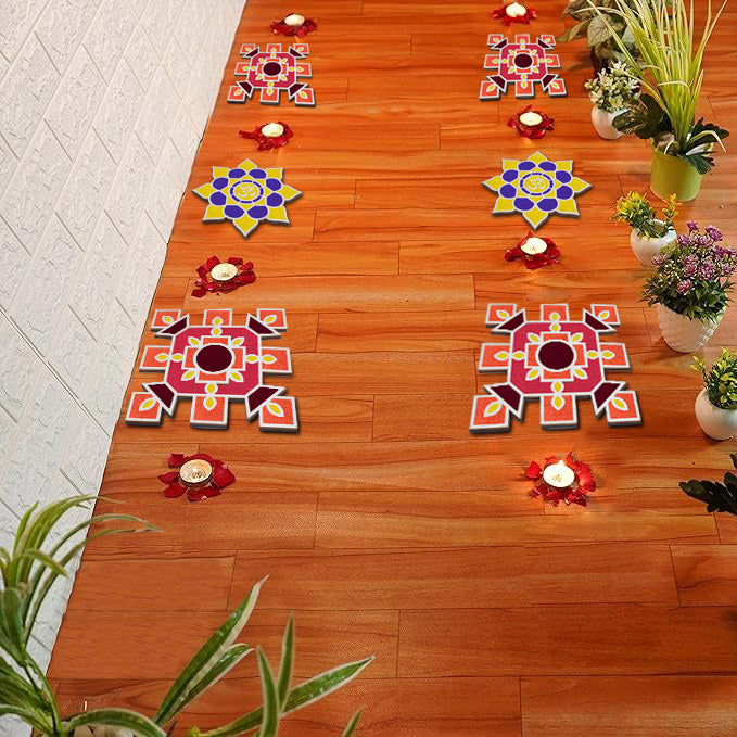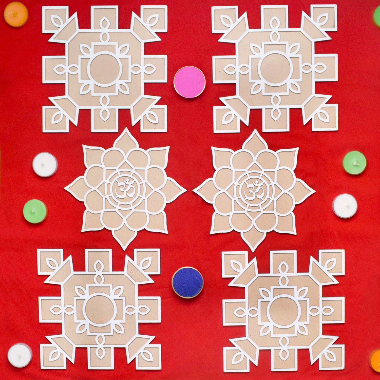 • Durable Materials: Crafted from wooden tools, the mat is built to last, ensuring you can use it for many Diwalis to come. Endless Design Possibilities: Explore an array of designs, from traditional kolam patterns to modern floral and border designs, with our versatile stencils.