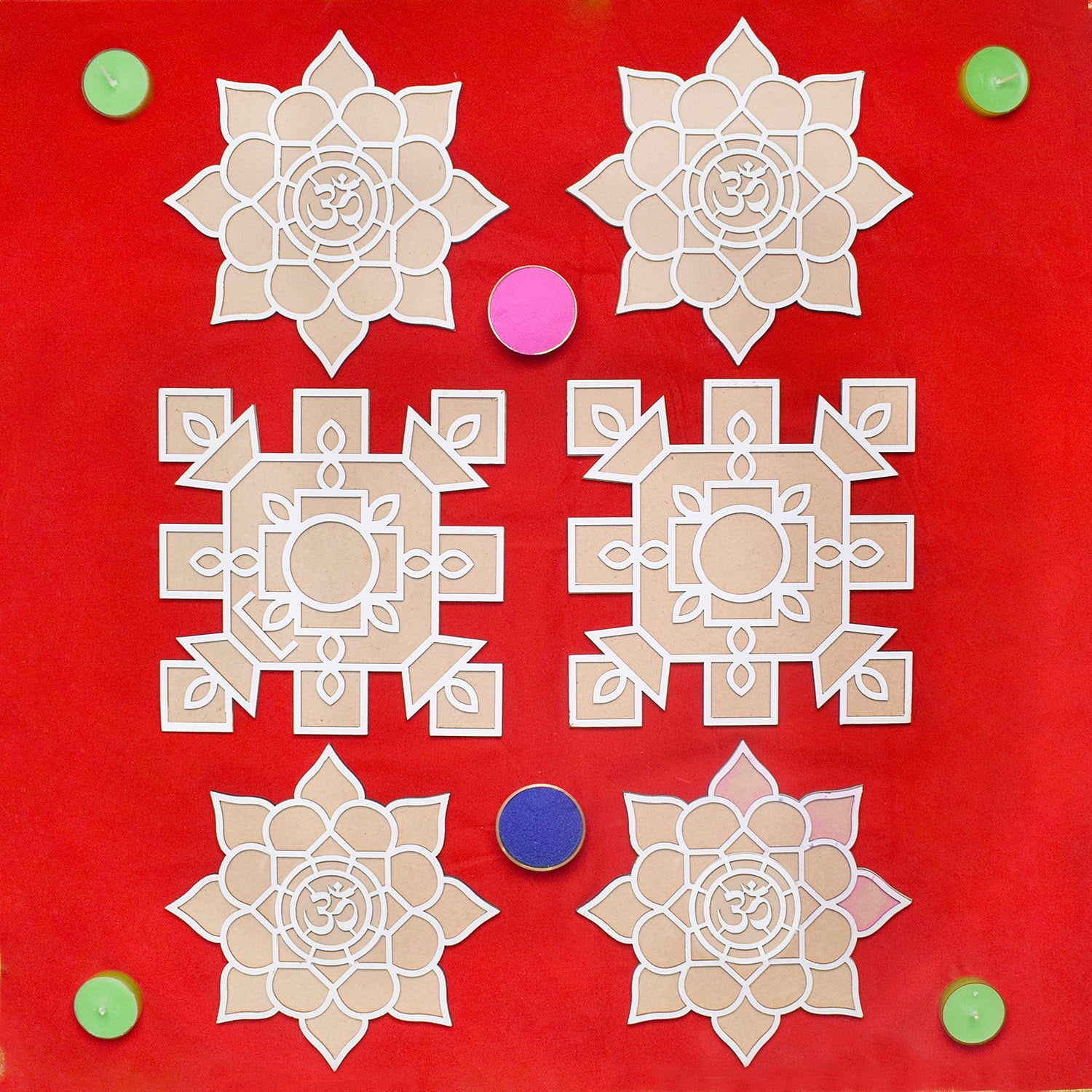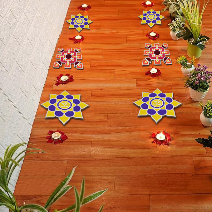 • Durable Materials: Crafted from wooden tools, the mat is built to last, ensuring you can use it for many Diwalis to come. Endless Design Possibilities: Explore an array of designs, from traditional kolam patterns to modern floral and border designs, with our versatile stencils.