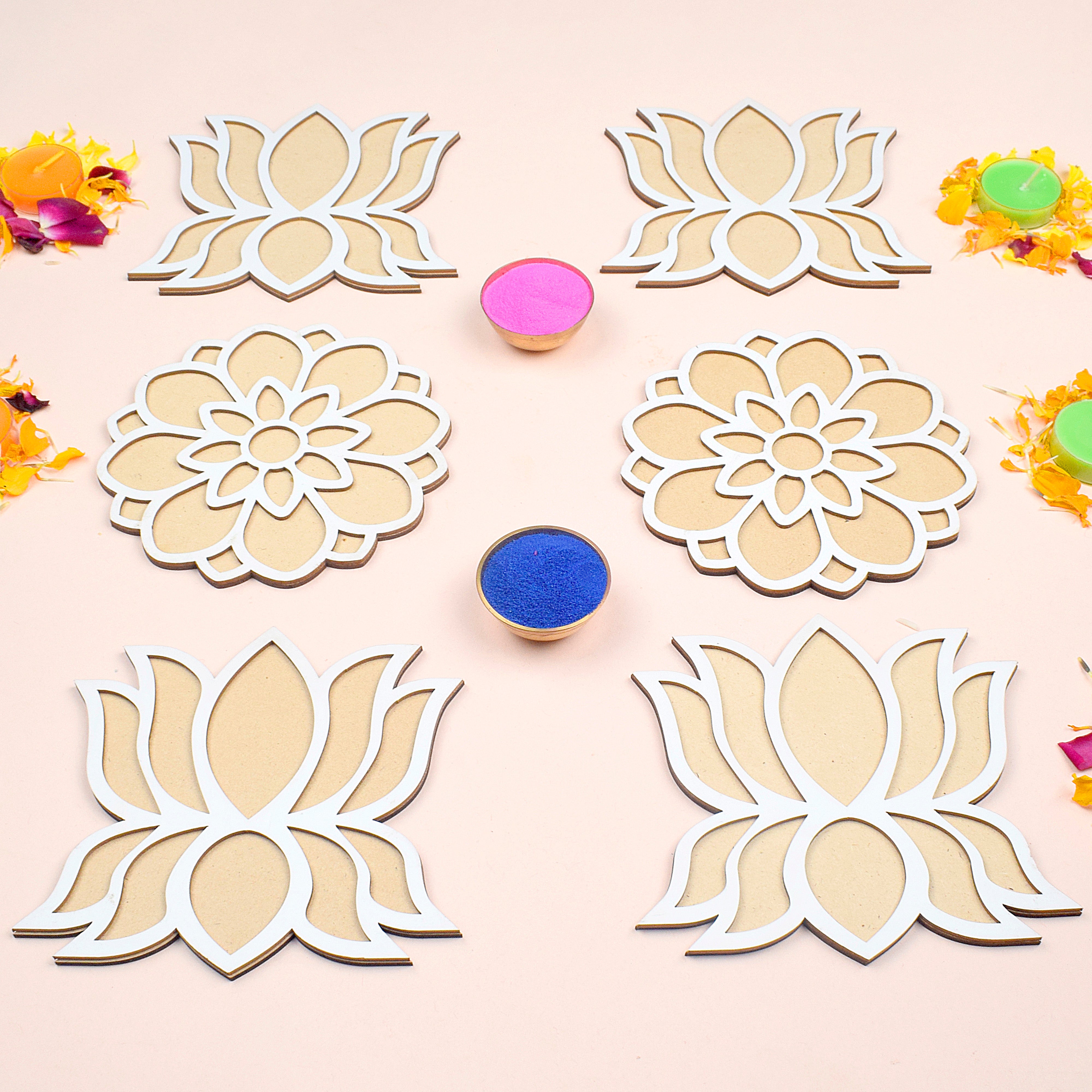 • Durable Materials: Crafted from wooden tools, the mat is built to last, ensuring you can use it for many Diwalis to come. Endless Design Possibilities: Explore an array of designs, from traditional kolam patterns to modern floral and border designs, with our versatile stencils.