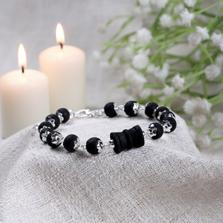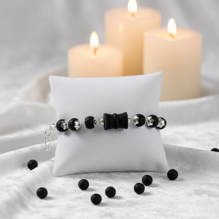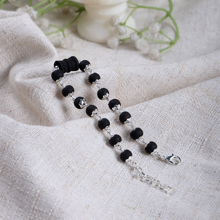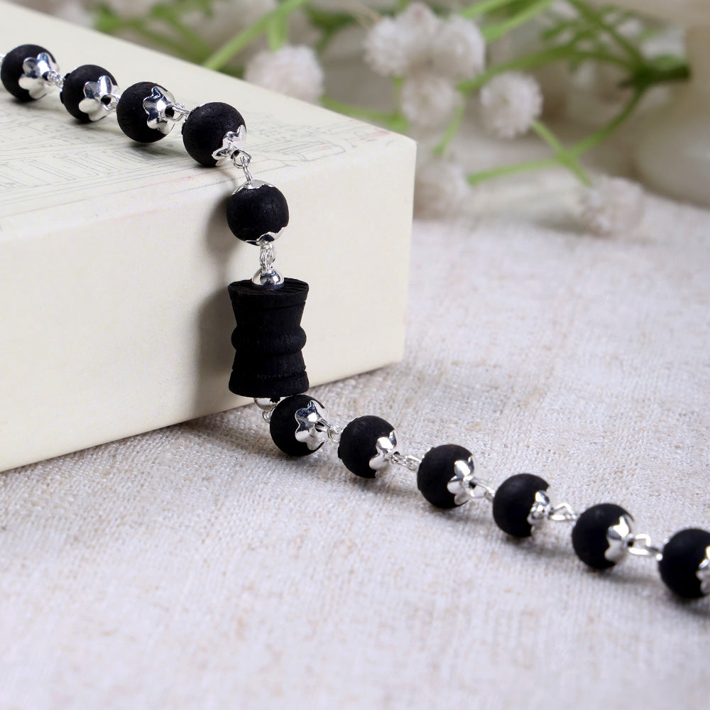 • Color: Natural Black Karungali Beads with Silver Accents