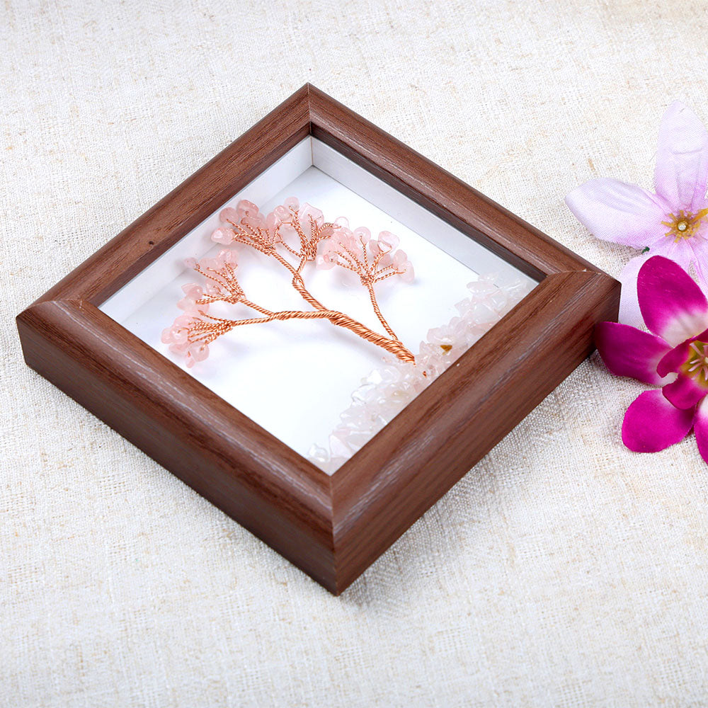 About the Product: The Rose Quartz Tree with Frame is a gentle healing stone dΓ©cor piece designed to attract love, harmony, and emotional healing into your space. Crafted with natural Rose Quartz crystal chips arranged in a delicate tree formation, this framed artwork symbolizes love, compassion, and emotional balance.