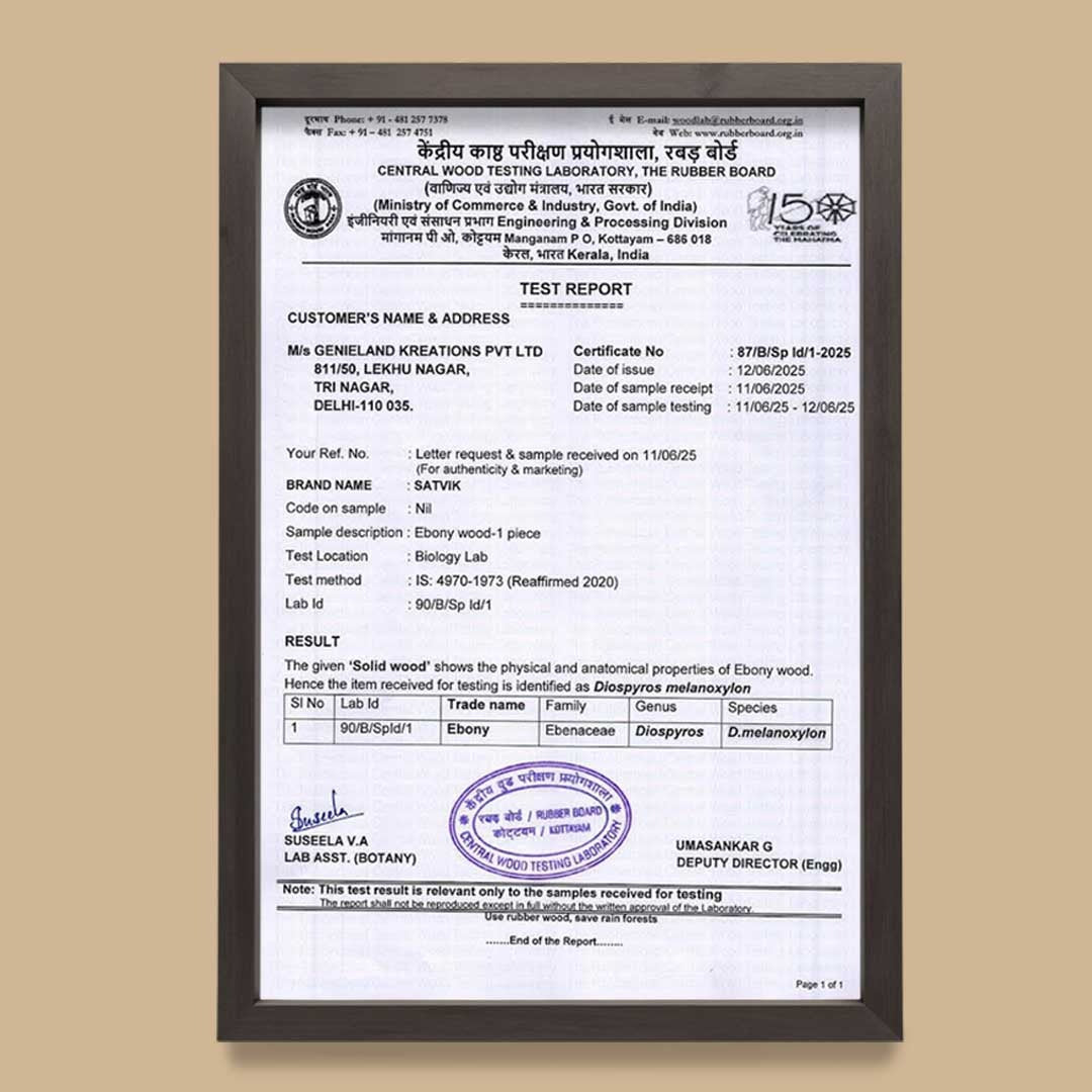 • Tested by : Authenticity certified by Central Wood Testing Laboratory The Rubber Board (Ministry of Commerce & Industry Govt. of India) and ICFRE – Forest Research Institute, Dehradun – ensuring genuine Karungali wood quality.