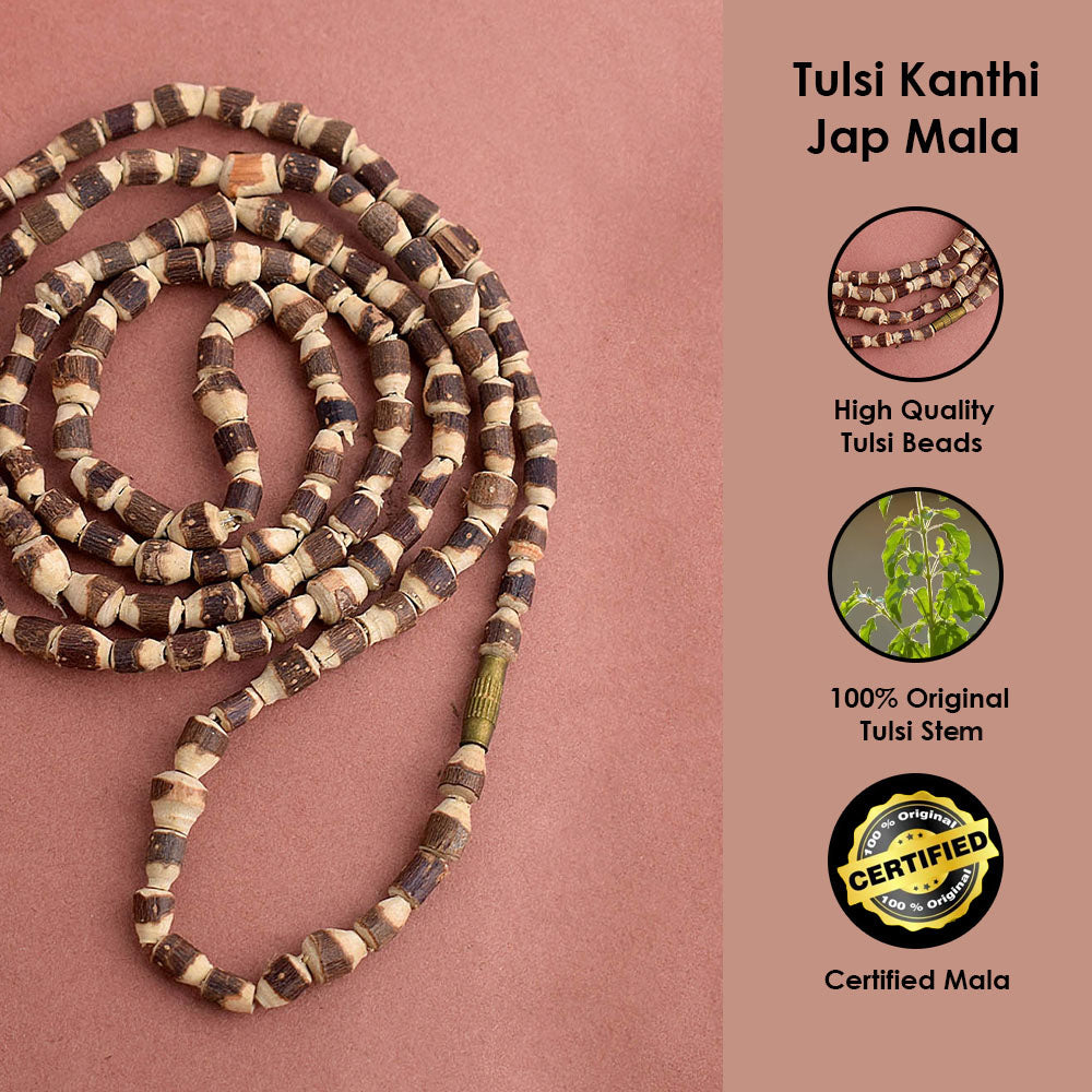 A Tulsi Mala is a string of beads made from the wood of the sacred Tulsi plant (Ocimum sanctum). It is widely used in Hinduism, Jainism, and Buddhism for chanting (Japa) and wearing as a protective necklace. The power of Tulsi Mala is believed to enhance spirituality, bring inner peace, and protect the wearer from negative energies.