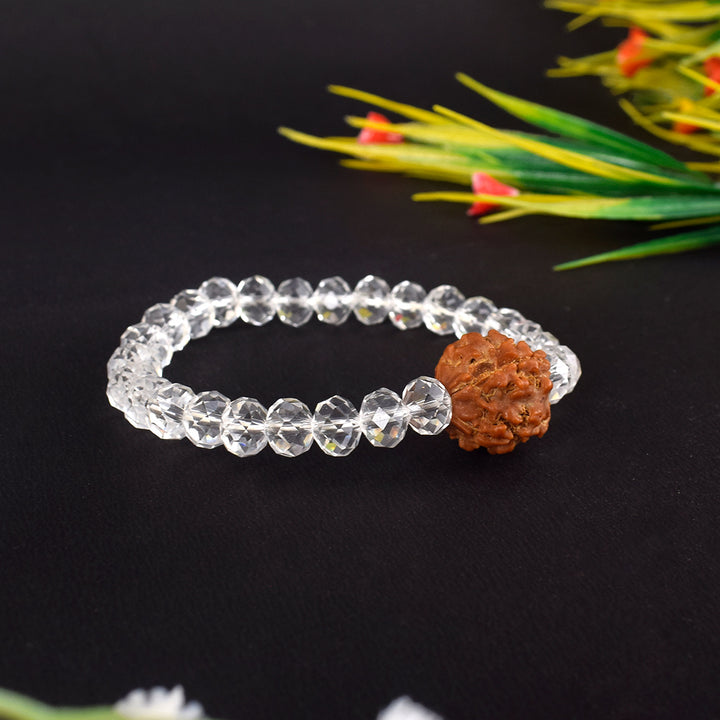 About Product: The 4 Mukhi Rudraksha Bracelet with Sphatik Beads is a sacred spiritual bracelet that represents Lord Brahma, the creator of the universe. The 4 Mukhi Rudraksha is known to enhance memory, knowledge, and communication skills, making it especially beneficial for students, teachers, and professionals.