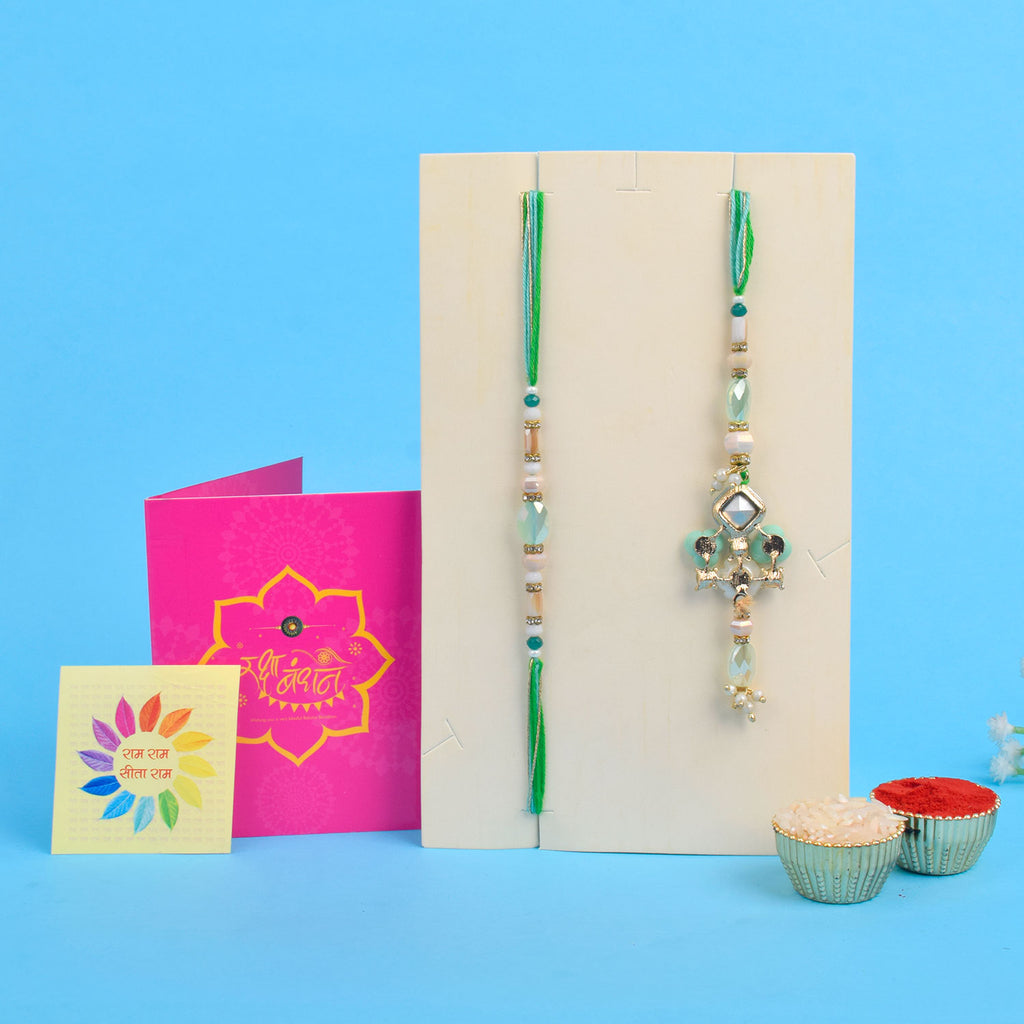 • Package: 1 Men Rakhi, 1 Women Lumba Rakhi, Roli Chawal Pack, Ram & Sita Theme Stickers
