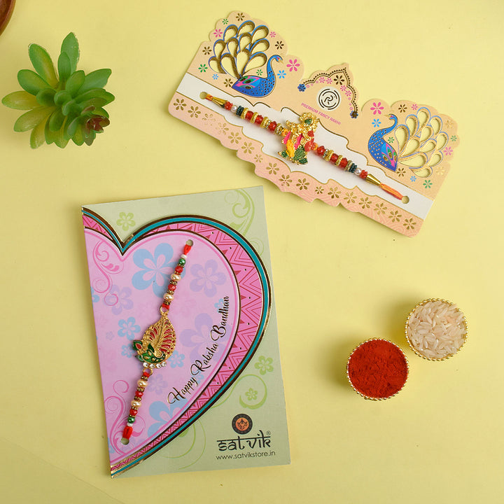 Beaded Bhaiya Rakhi Set of 2: Bedecked with colorful beads, these rakhis represent the joyous moments and cherished memories of growing up together. Embrace nostalgia and affection with this delightful beaded rakhi set.