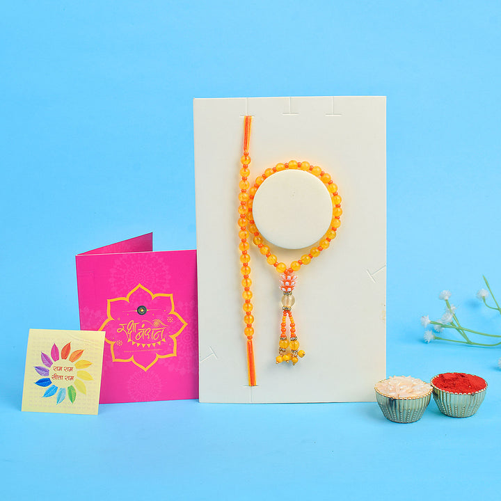 • Package: 1 Men Rakhi, 1 Women Lumba Rakhi, Roli Chawal Pack, Ram & Sita Theme Stickers