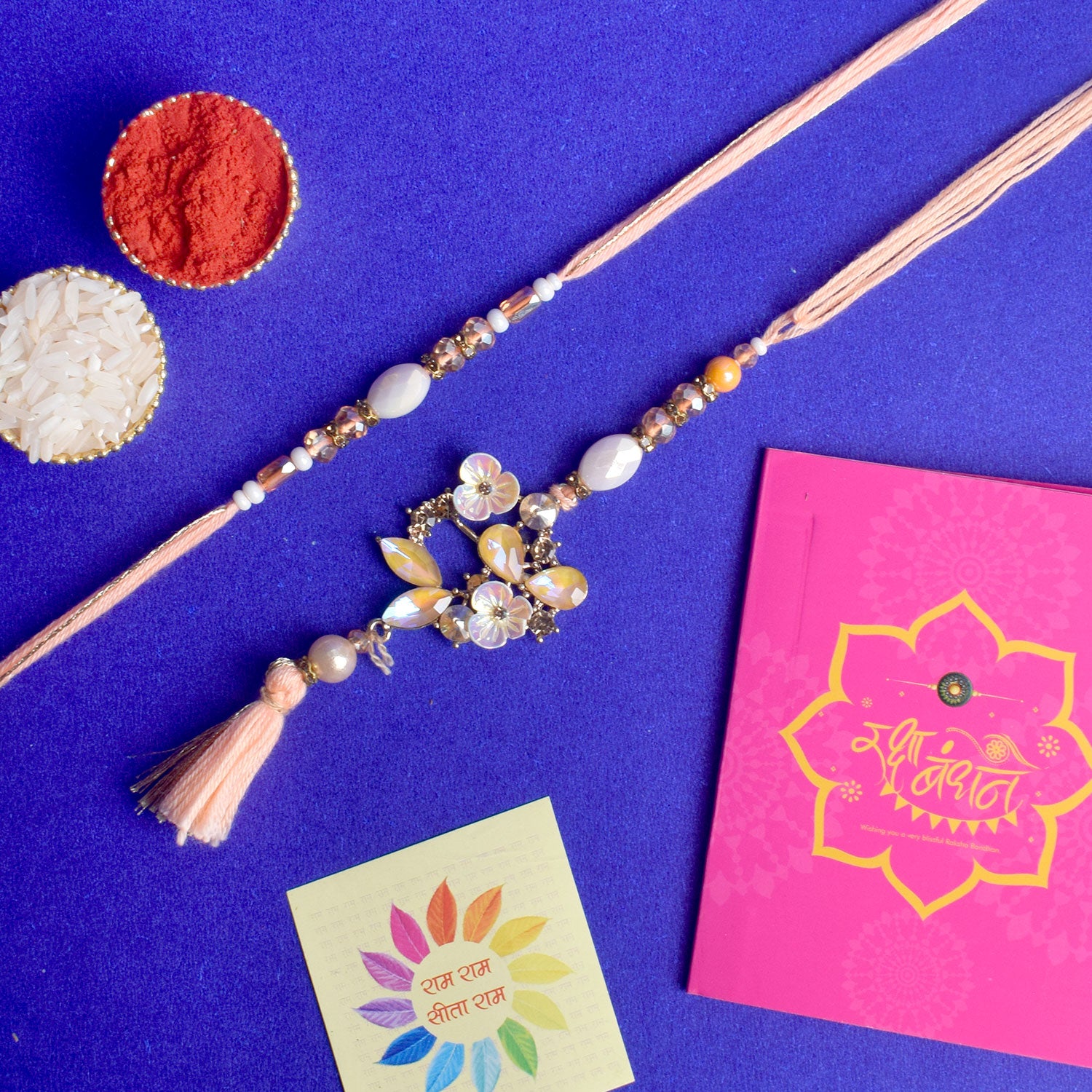 • Package: 1 Men Rakhi, 1 Women Lumba Rakhi, Roli Chawal Pack, Ram & Sita Theme Stickers