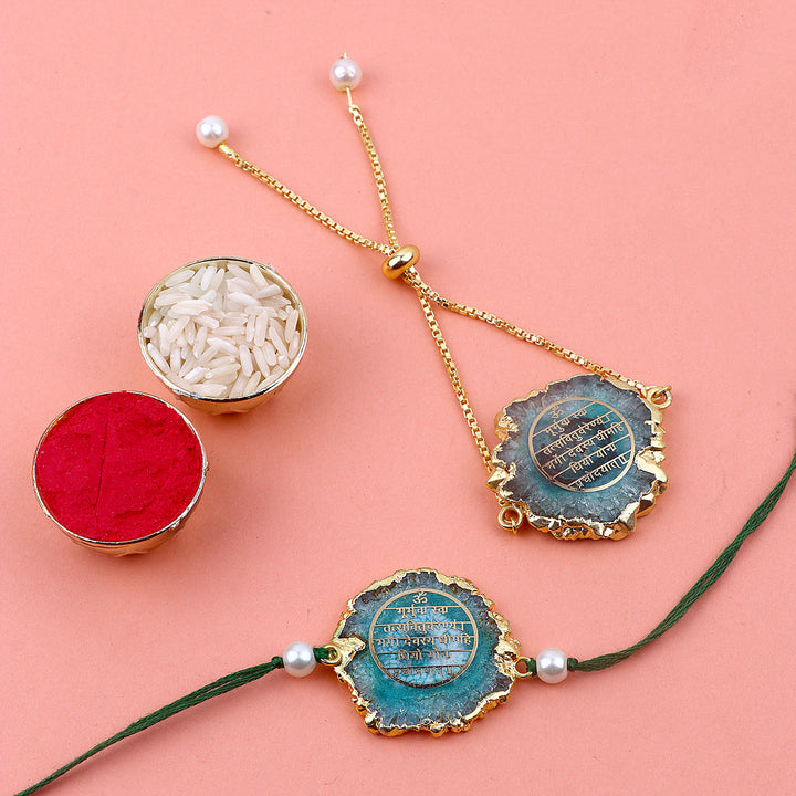 Harmony and Grace: Agate Stone Gayatri Mantra Rakhi for Bhaiya Bhabhi