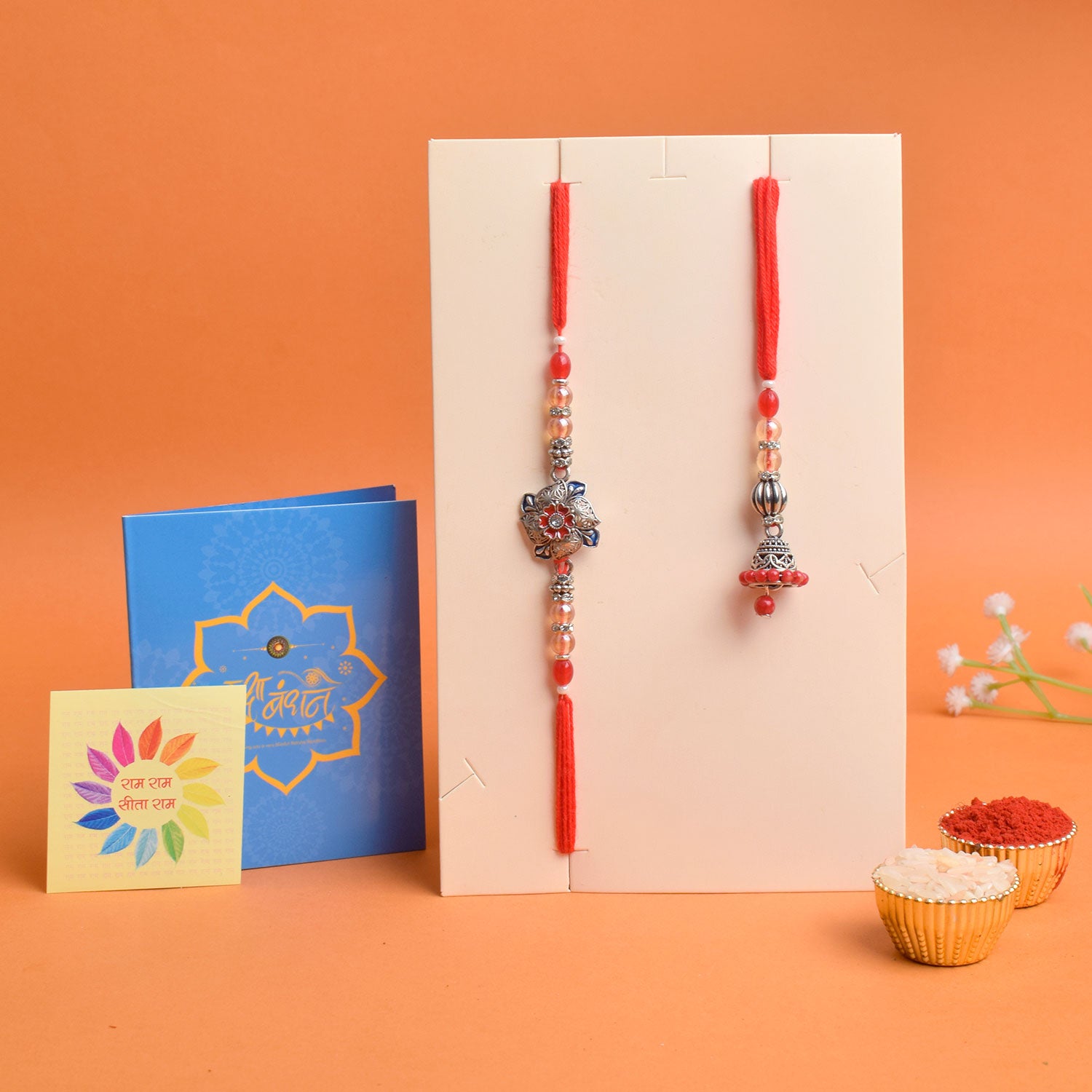 • Package: 1 Men Rakhi, 1 Women Lumba Rakhi, Roli Chawal Pack, Ram & Sita Theme Stickers
