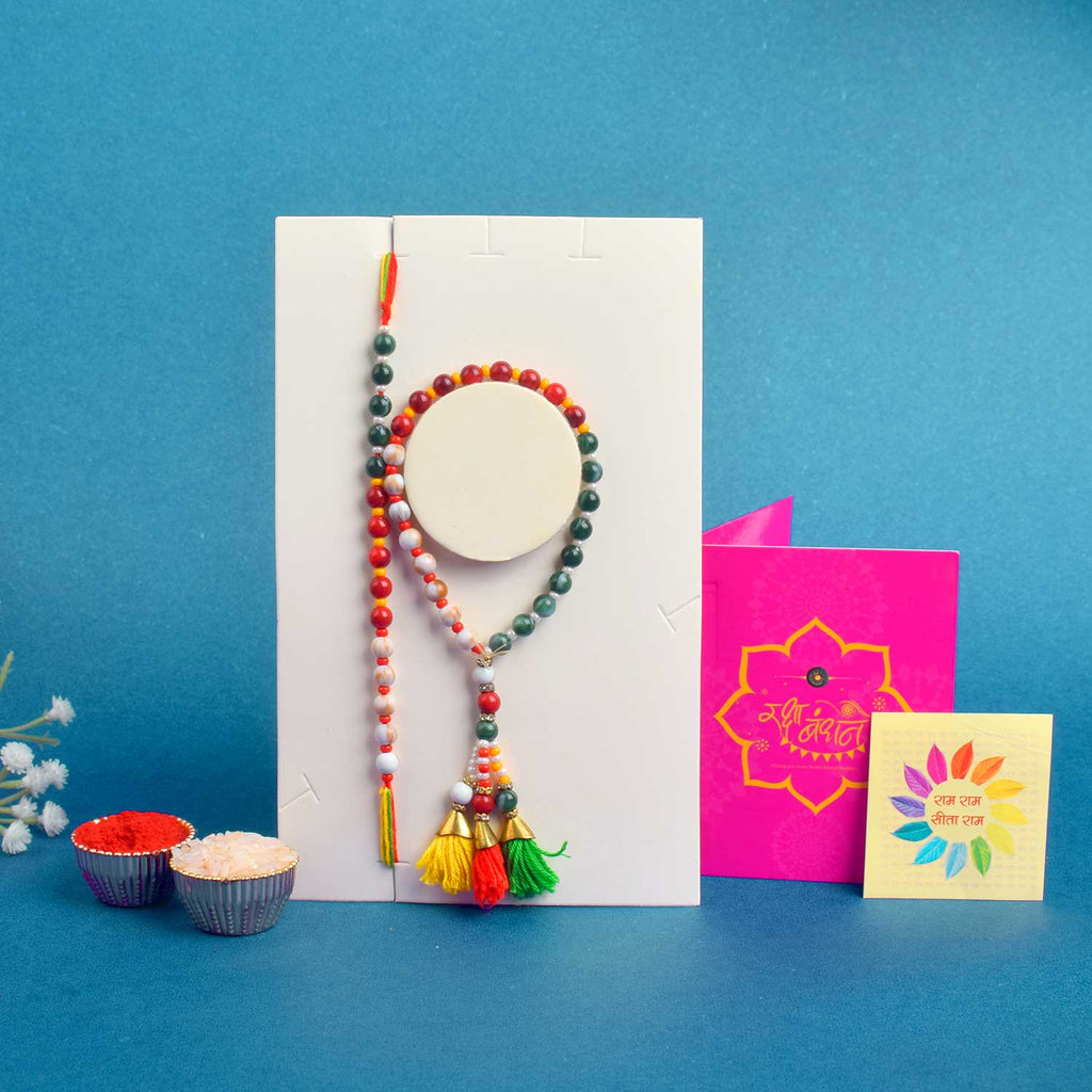 • Package: 1 Men Rakhi, 1 Women Lumba Rakhi, Roli Chawal Pack, Ram & Sita Theme Stickers