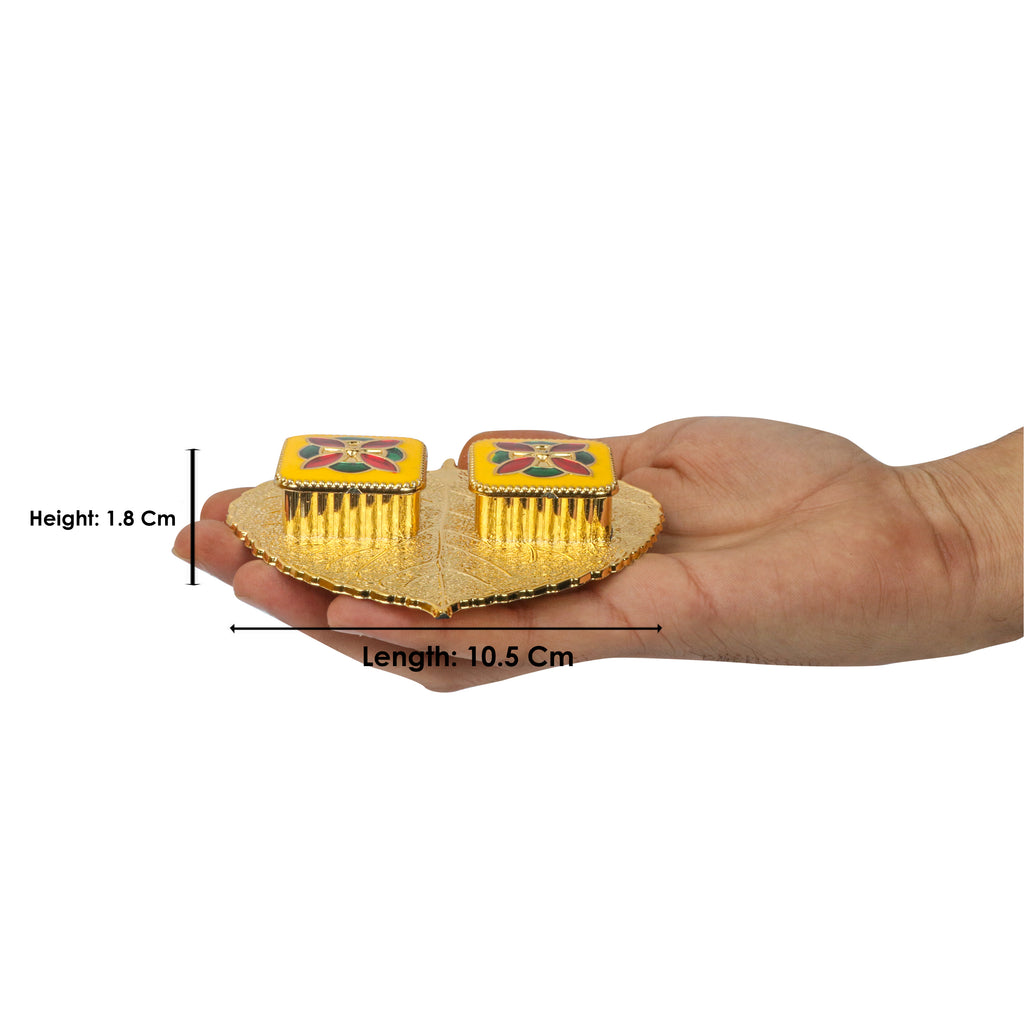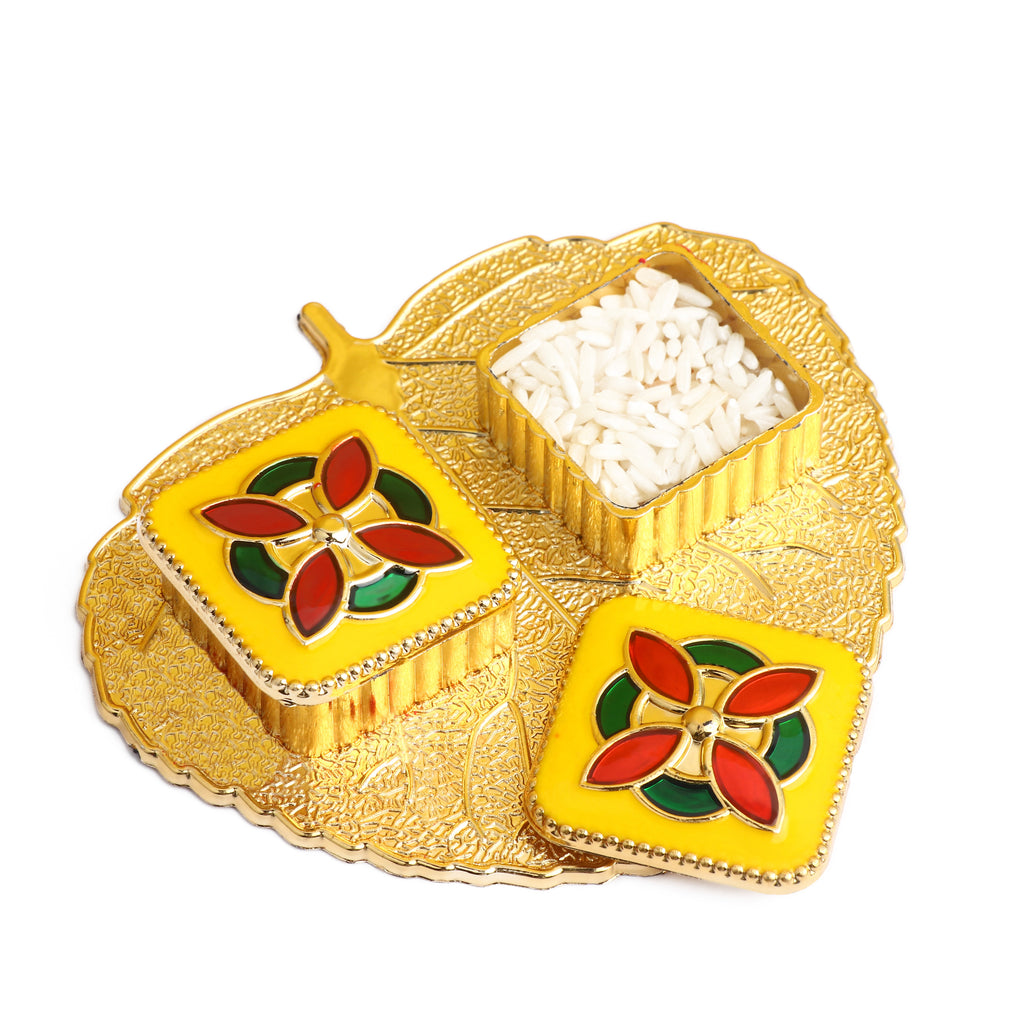 About Product: Satvik Store Presents Adorable Roli Akshat Platter. This small and adorable platter comes adorned with meenakari work and two small bowls attached for roli and akshat on leaf.