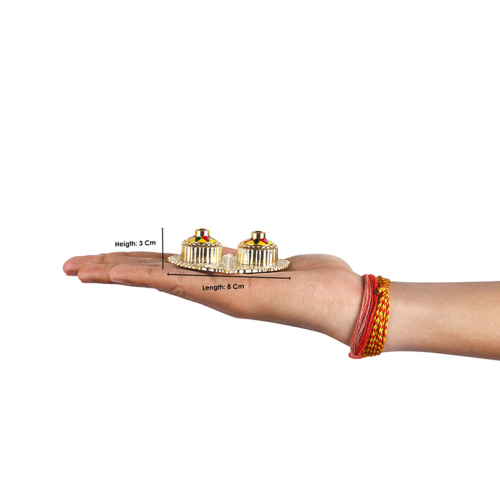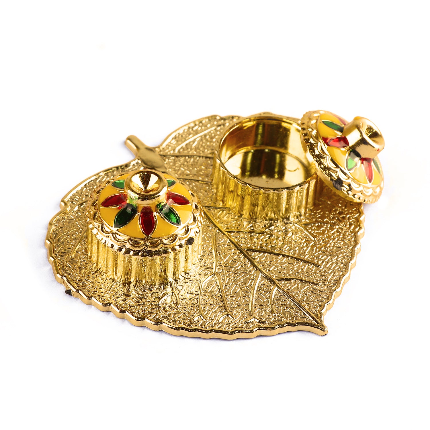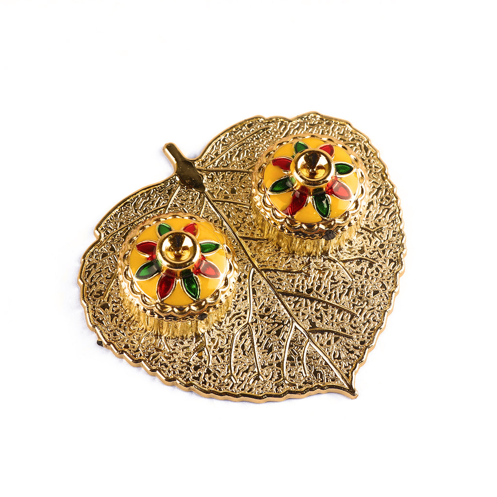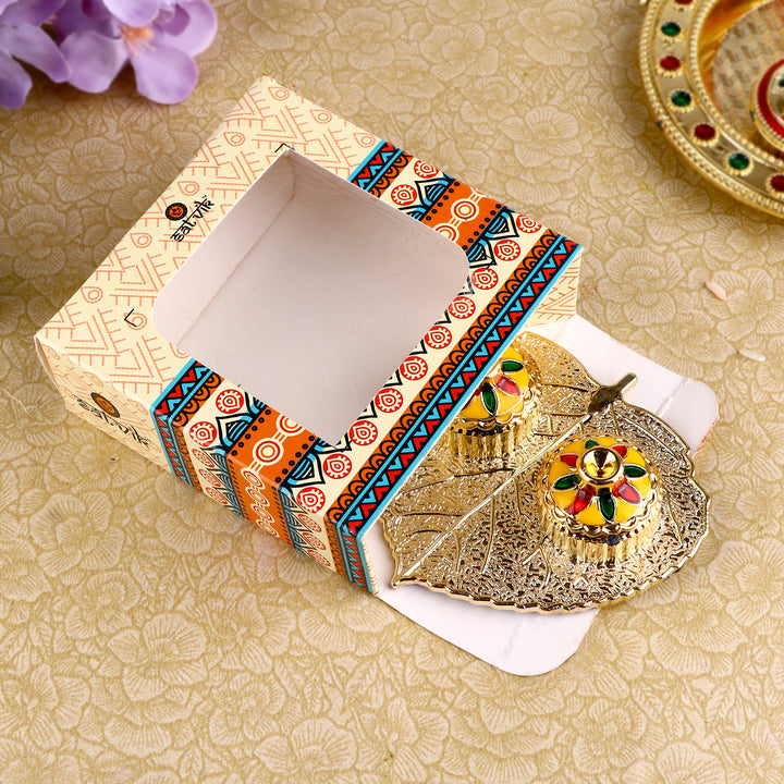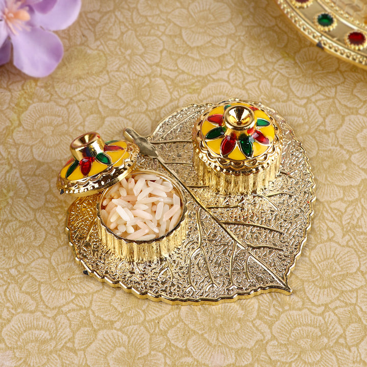 About Product: Satvik Store Presents Beautiful Roli Akshat Small Pan Leaf Platter. This small and adorable platter comes adorned with meenakari work and two small bowls attached for roli and akshat on leaf.
