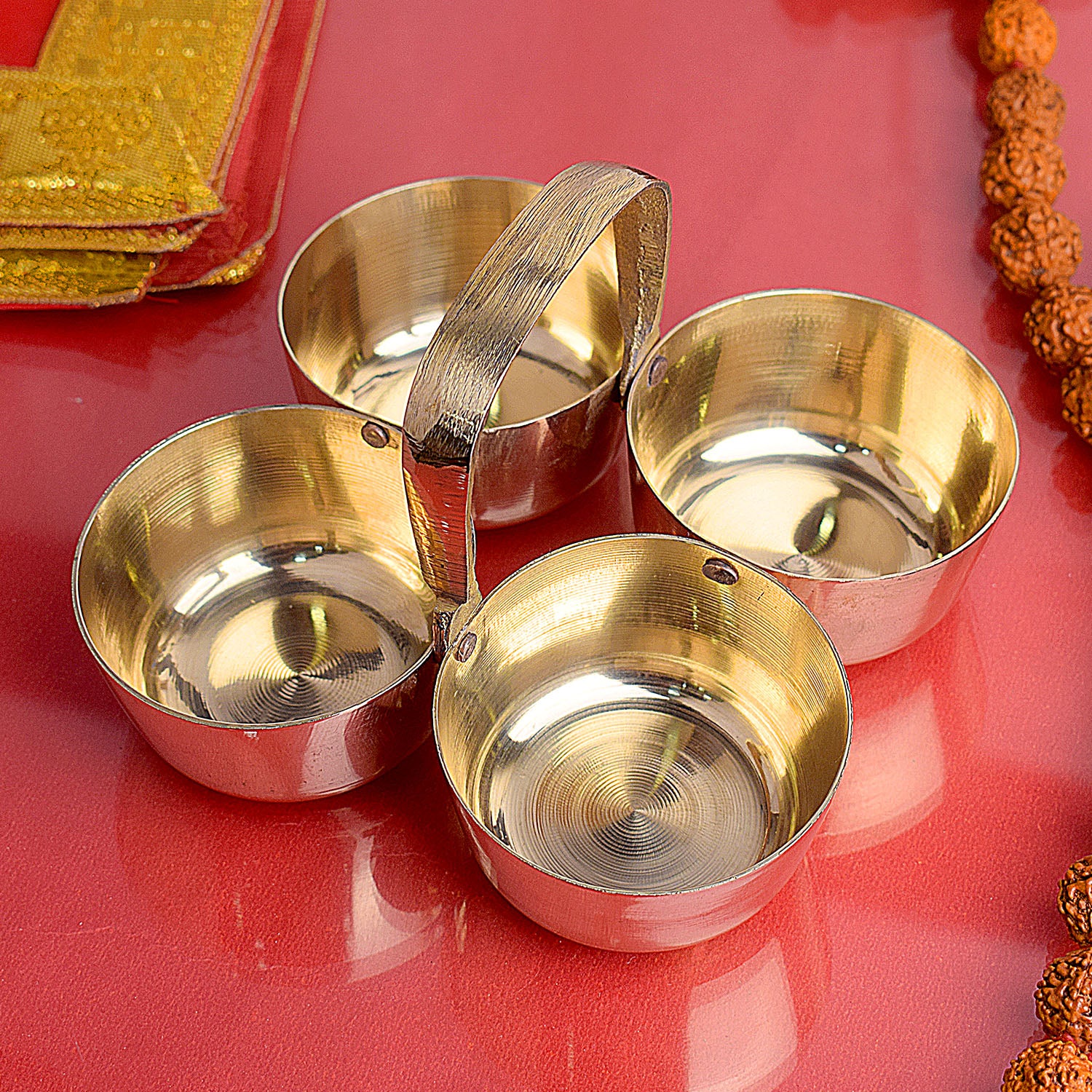 About Product: Elevate your spiritual rituals with our exquisite Puja Chopda 4-Bowl Holder, meticulously crafted to enhance your worship experience. This elegantly designed holder is an essential addition to your sacred space, providing a convenient and organized solution for offering Roli, Chawal, Haldi, and Kumkum during pujas and ceremonies. Chowmukh Haldi Kumkum Puja Items Holder is a Four Container attached with a holder. This Chowmukh Bring a shiny and beautifully Crafted auspicious chowmuka haldi Chawal(Rice) Holder made up of Pure Virgin Brass Material, Can be used for Worship at home temple office etc, also an ideal gift to relatives and love ones. It is durability and is easy to clean.