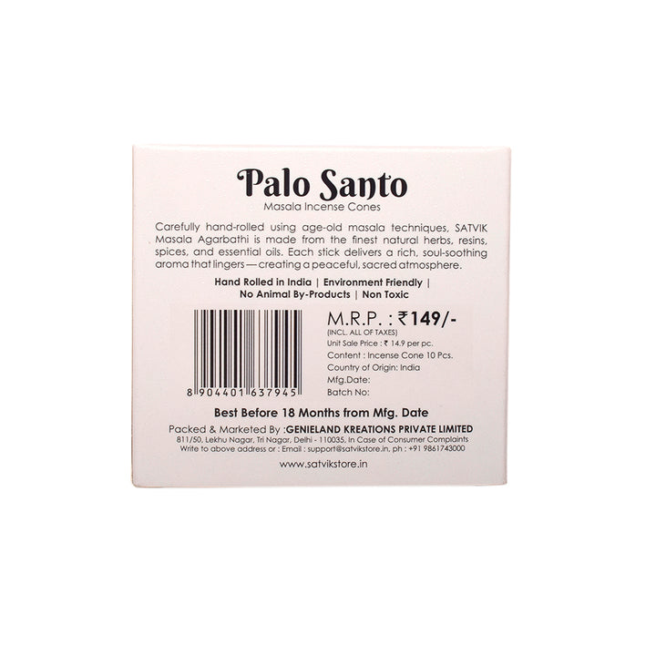 About Product: Palo Santo, also known as the β€œHoly Wood,” has been used for centuries in spiritual and healing practices. These Palo Santo Pure Masala Incense Cones are handcrafted using authentic Palo Santo wood powder, herbs, and essential oils, giving a rich, grounding fragrance that cleanses and purifies your surroundings.