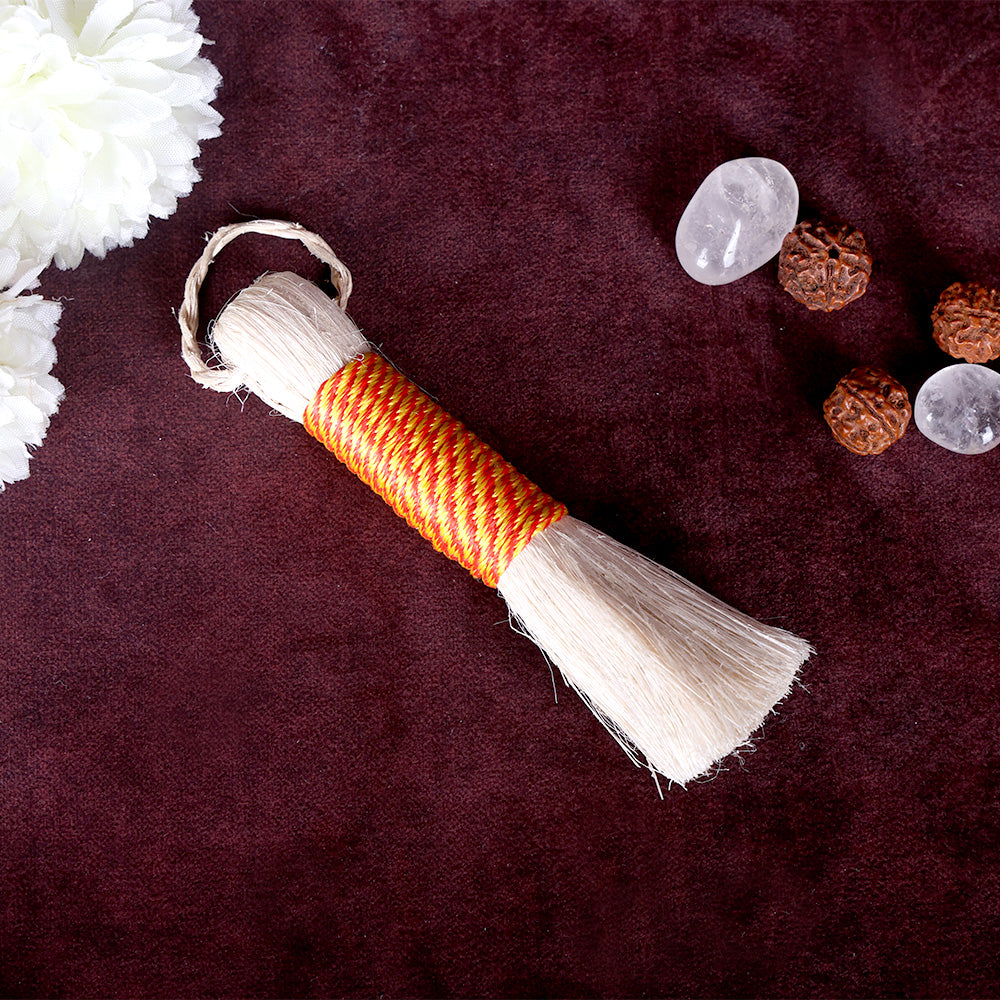The Banana plant is a symbol of prosperity and holds a special place in ancient scriptures, associated with Lord Krishna and Goddess Lakshmi. Om Shanthi Puja Broom, crafted from pure Banana Stem Fiber, is designed for keeping your Puja space clean and dust-free. Its aesthetic design ensures thorough cleaning of every nook and corner, with an 12 centimeter height and a weight of approximately 25 grams. Keep your Puja space pure and invoke the blessings of Goddess Lakshmi with the Om Shanthi Puja Broom, a versatile tool for cleaning Puja rooms.
