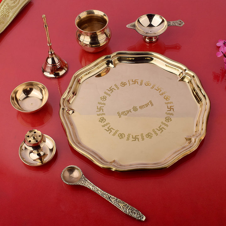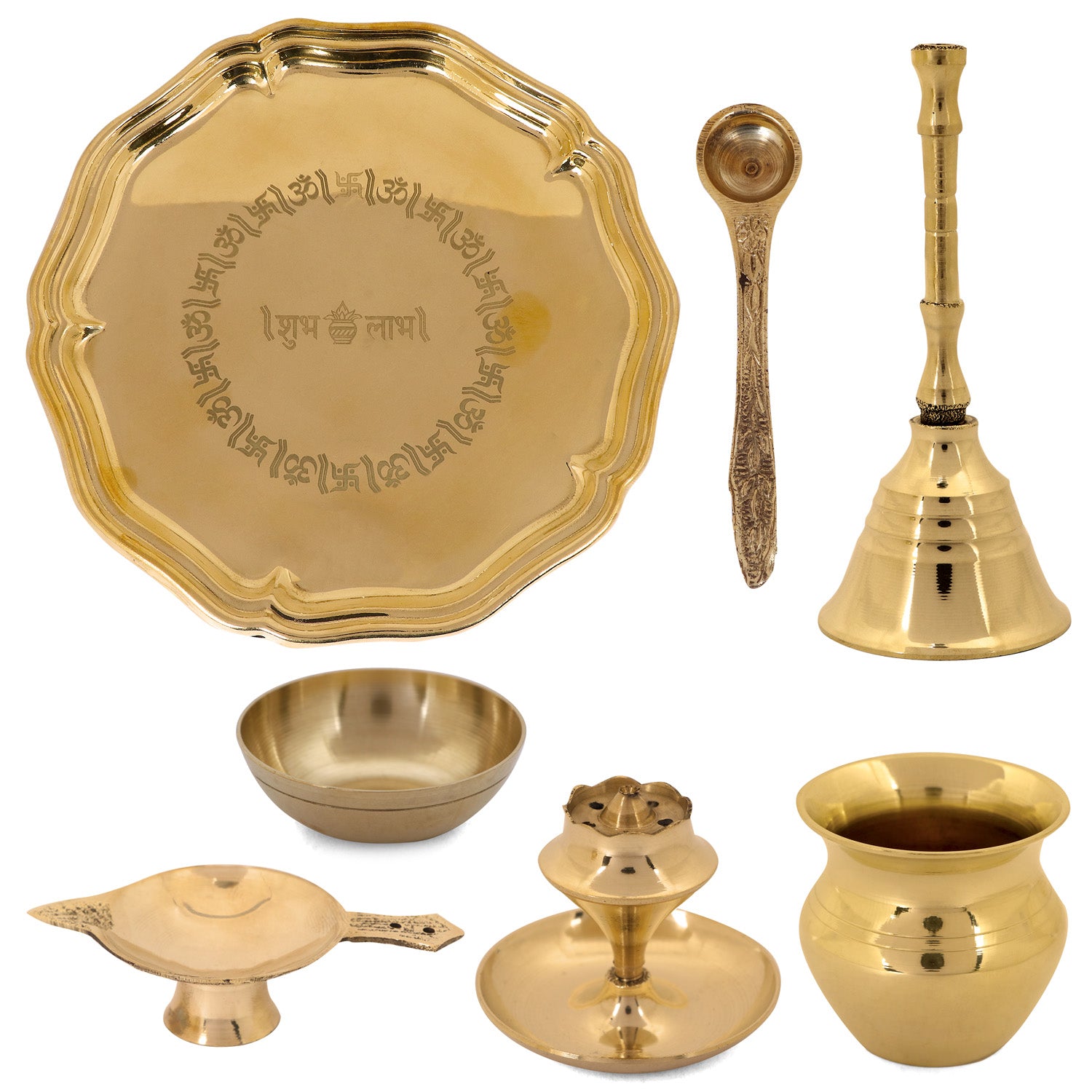 Package Content:Β 7 Pc set of 1 Puja Thali, 1 Ghanti (Bell),1 Puja Bowl, 1 Agarbatti Holder, 1 Brass Kalash(Lota), 1 Aarti Diya, 1 Spoon are the best suitable for Pooja