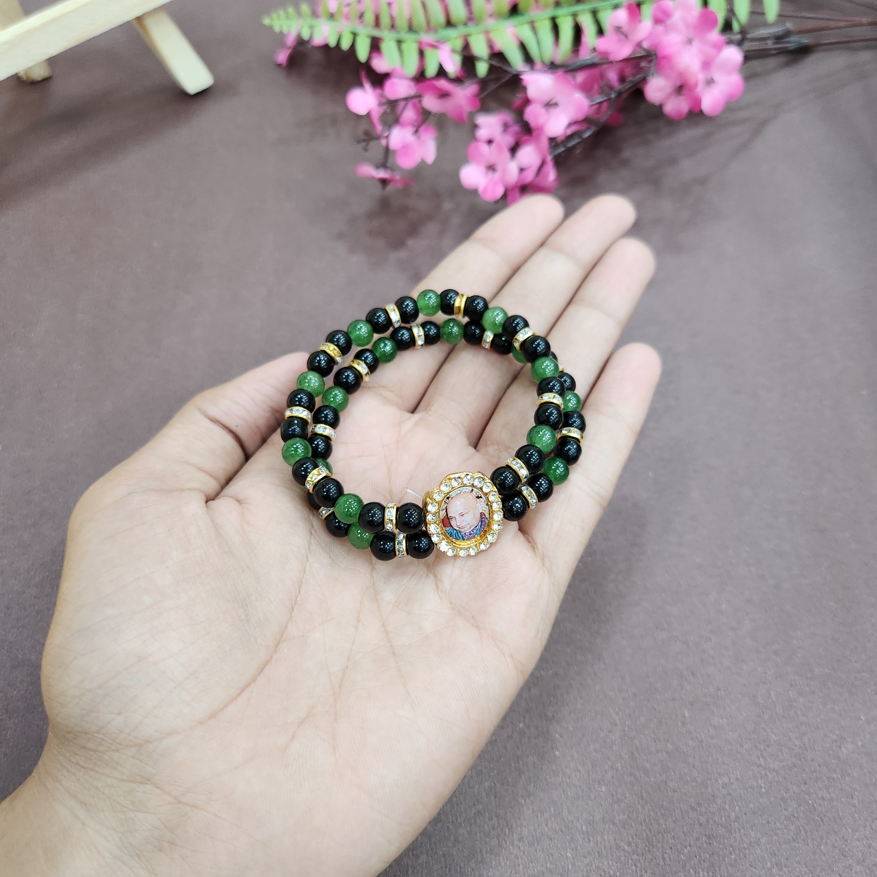 • Item Name:  Black And Green Round Pearl Bracelet with Jai Guruji Swaroop Handmade Bracelets for Men and Women.
