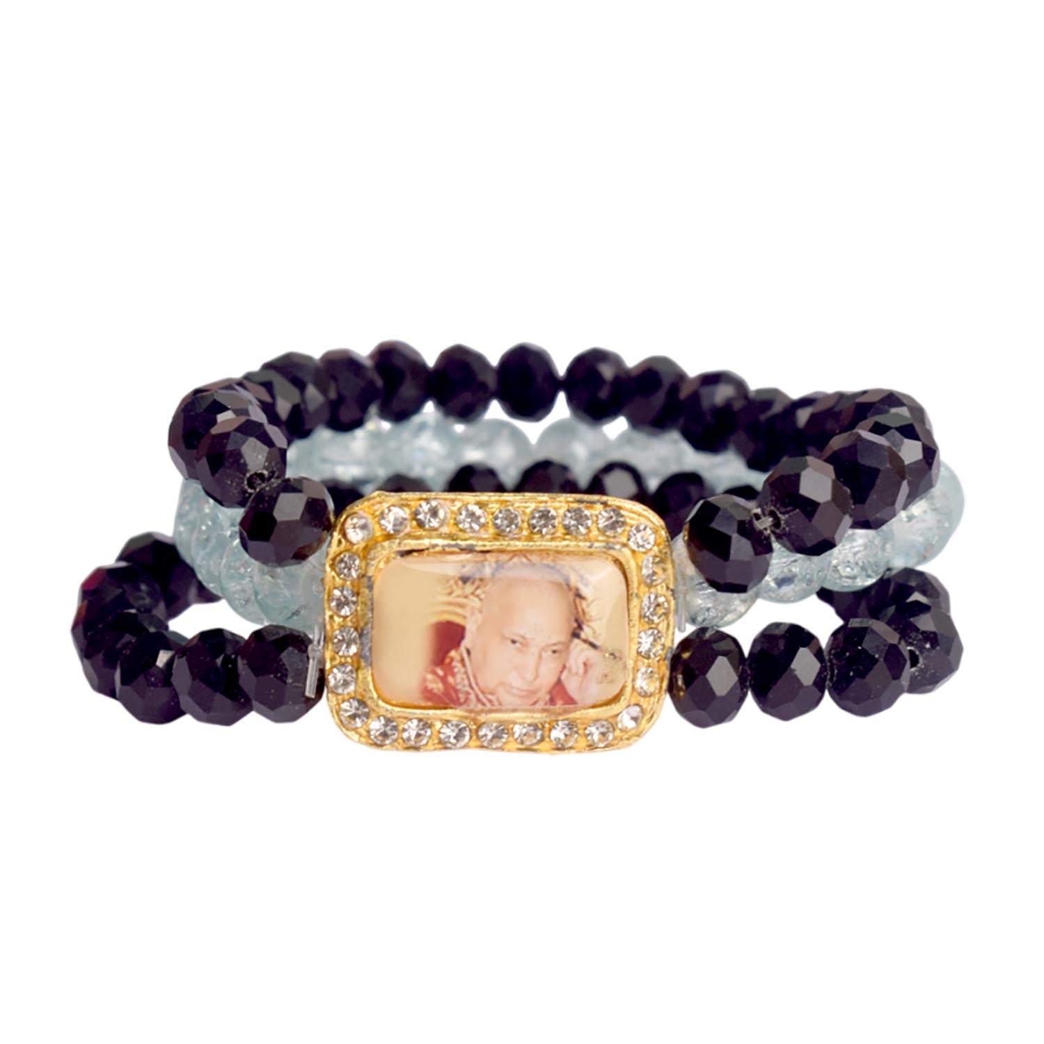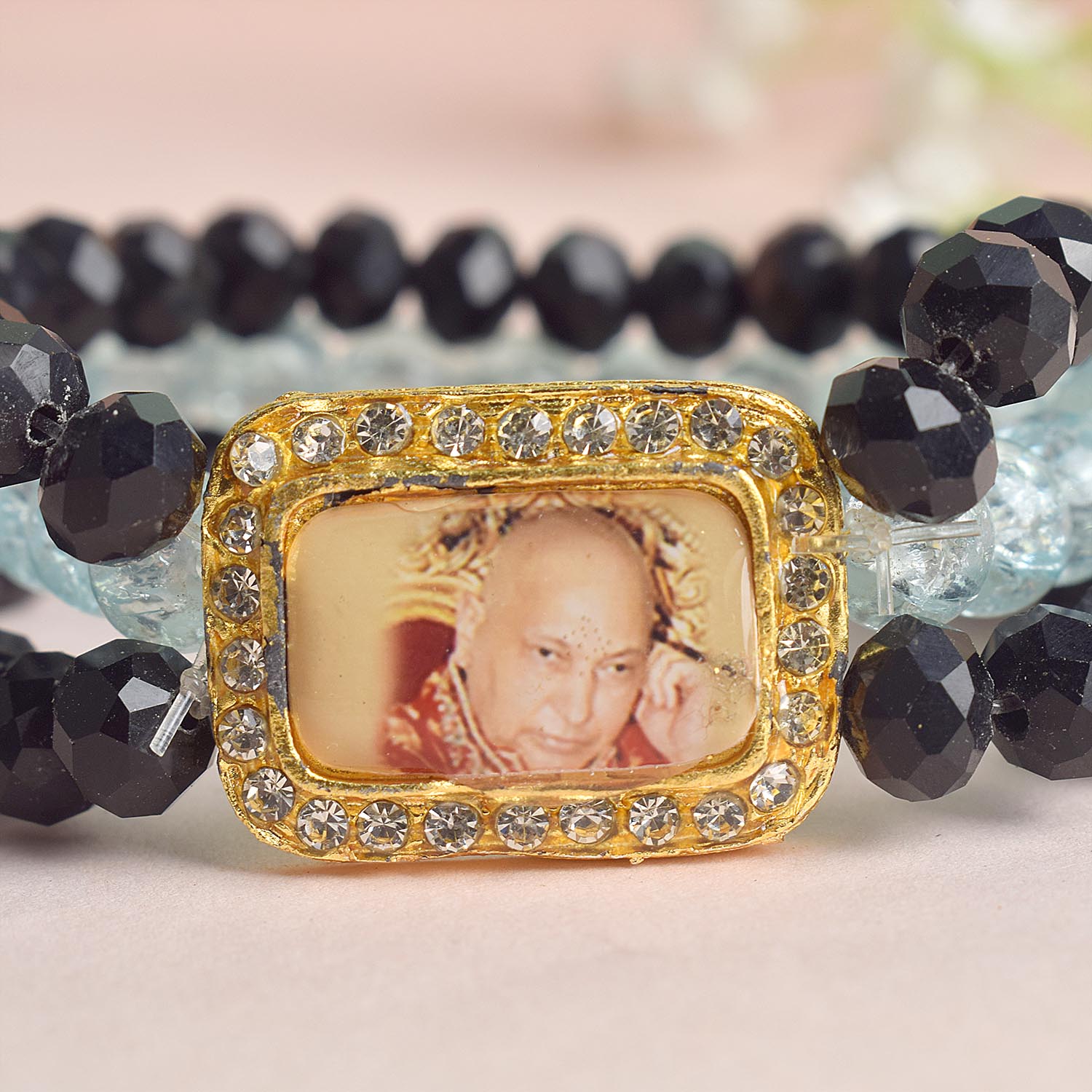 black baby blue guruji bracelet | triple layer bracelet | black beads bracelet | baby blue beads bracelet | elegant guruji swaroop bracelet | stylish daily wear bracelet | guruji bracelet for men and women | spiritual bracelet india | jai guruji bracelet | handmade spiritual jewellery | pooja return gift | satvikstore bracelet | pastel spiritual bracelet | multi layer guruji bracelet | graceful guruji bracelet | soft colour jewellery | india spiritual brand