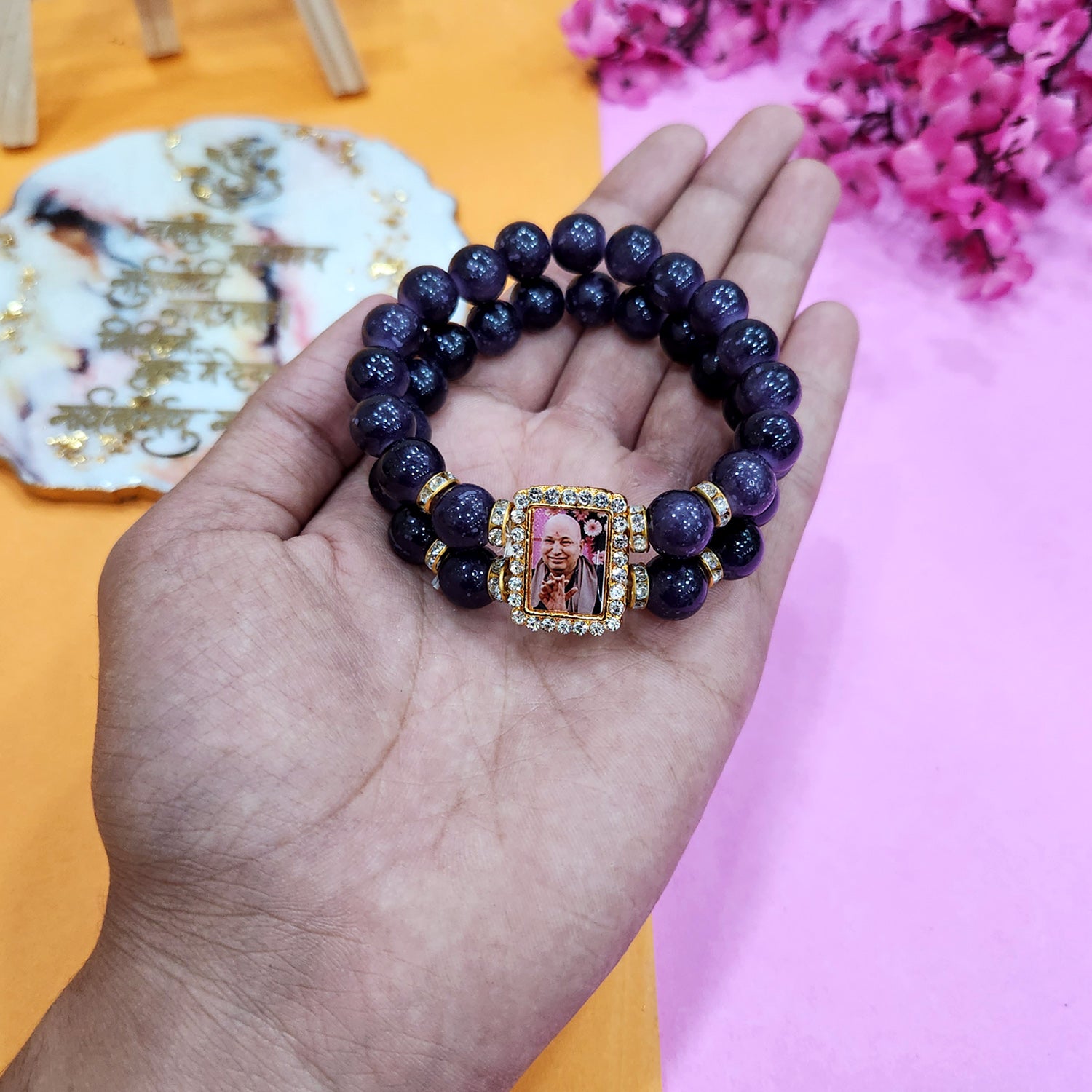 Our Guruji bracelet is a tangible symbol of divine connection. Crafted with care and reverence, it is designed to be worn close to your heart, serving as a constant reminder of Guruji's presence. The bracelet is adorned with sacred symbols and gemstones that hold spiritual significance, channeling positive energy and protection.