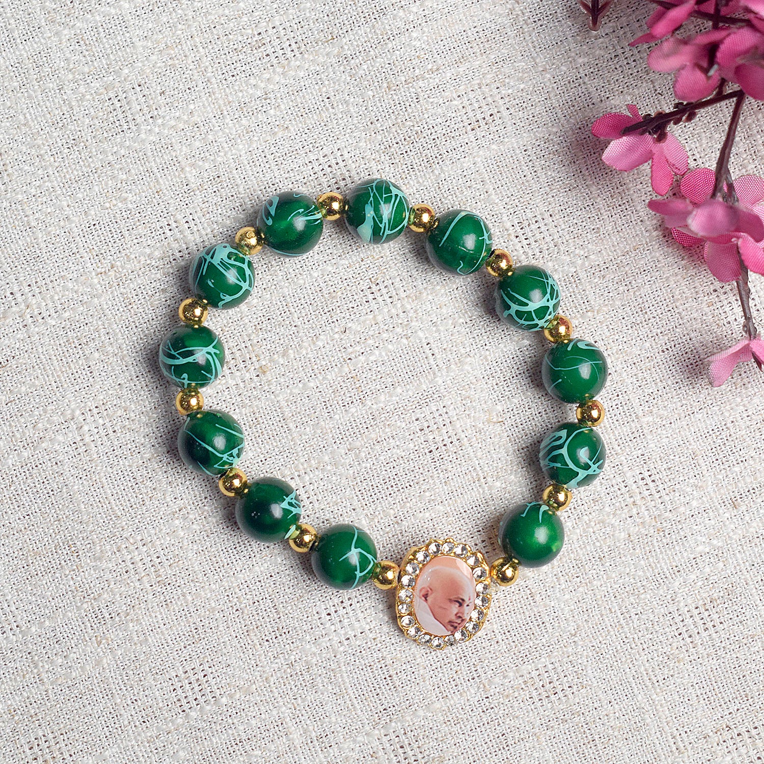 • Item Name: Dark Green Round Pearl Bracelet with Jai Guruji Swaroop Handmade Bracelets for Men and Women