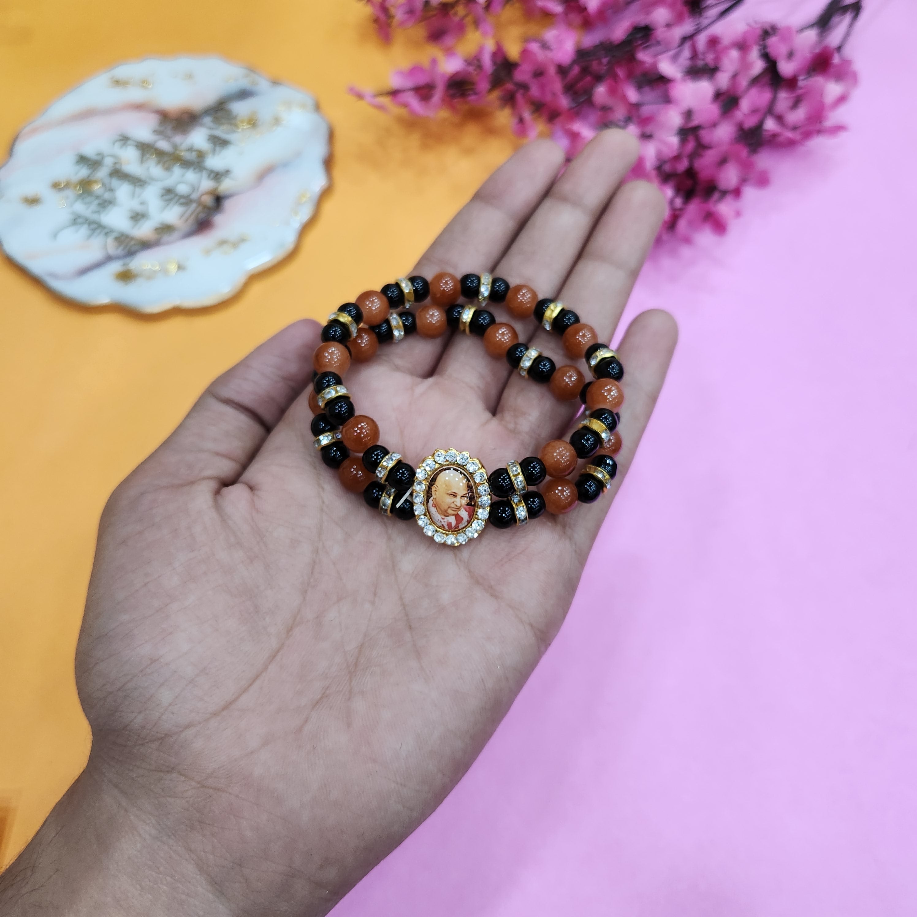 Our Guruji bracelet is a tangible symbol of divine connection. Crafted with care and reverence, it is designed to be worn close to your heart, serving as a constant reminder of Guruji's presence. The bracelet is adorned with sacred symbols and gemstones that hold spiritual significance, channeling positive energy and protection.
