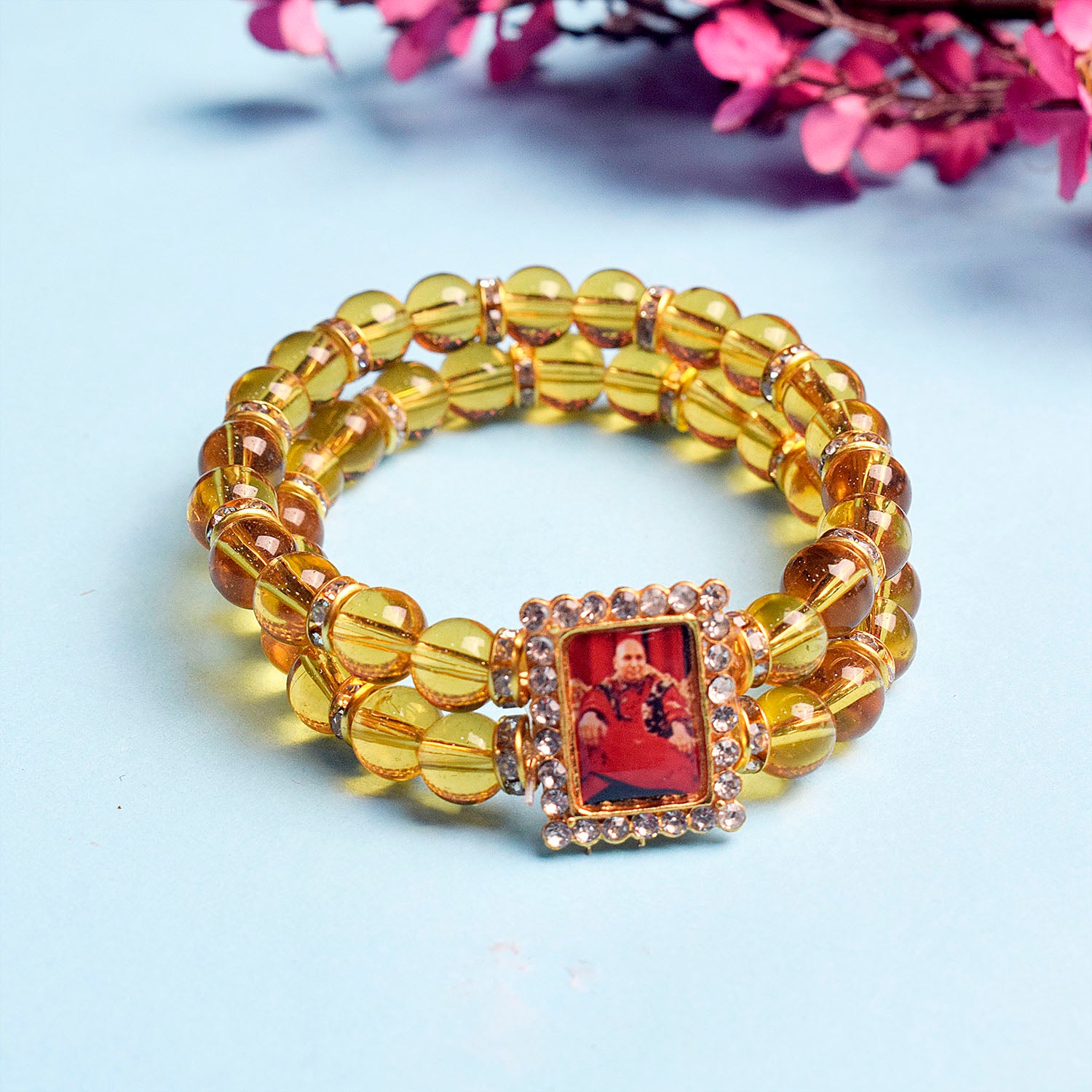 Our Guruji bracelet is a tangible symbol of divine connection. Crafted with care and reverence, it is designed to be worn close to your heart, serving as a constant reminder of Guruji's presence. The bracelet is adorned with sacred symbols and gemstones that hold spiritual significance, channeling positive energy and protection.