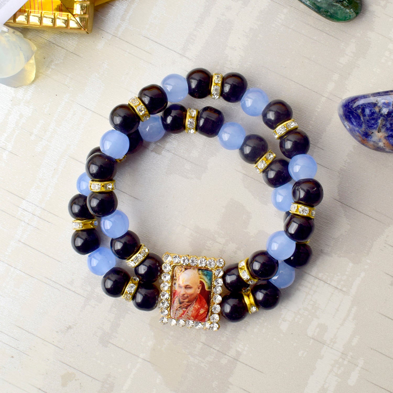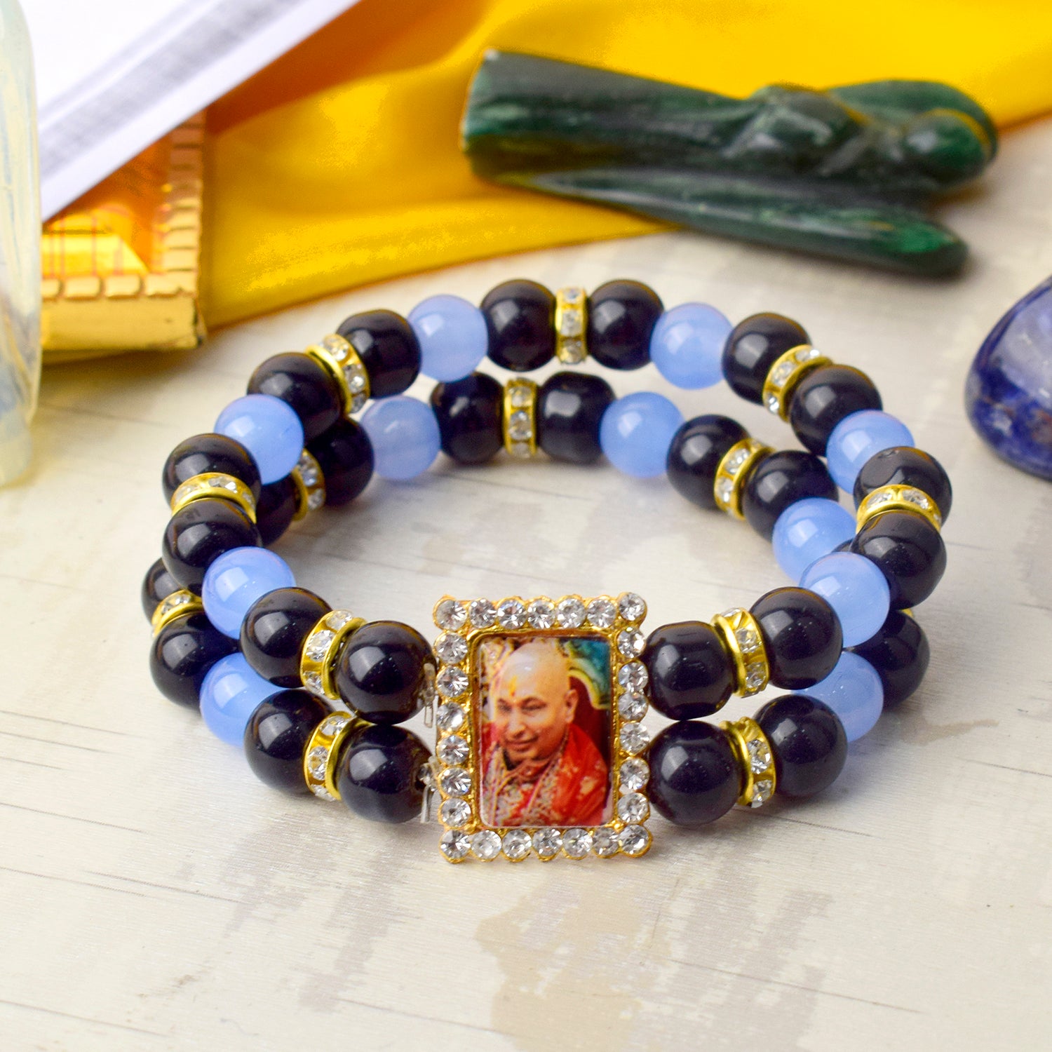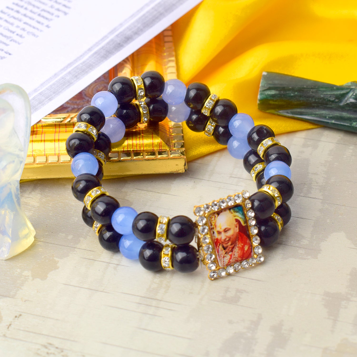 Our Guruji bracelet is a tangible symbol of divine connection. Crafted with care and reverence, it is designed to be worn close to your heart, serving as a constant reminder of Guruji's presence. The bracelet is adorned with sacred symbols and gemstones that hold spiritual significance, channeling positive energy and protection.