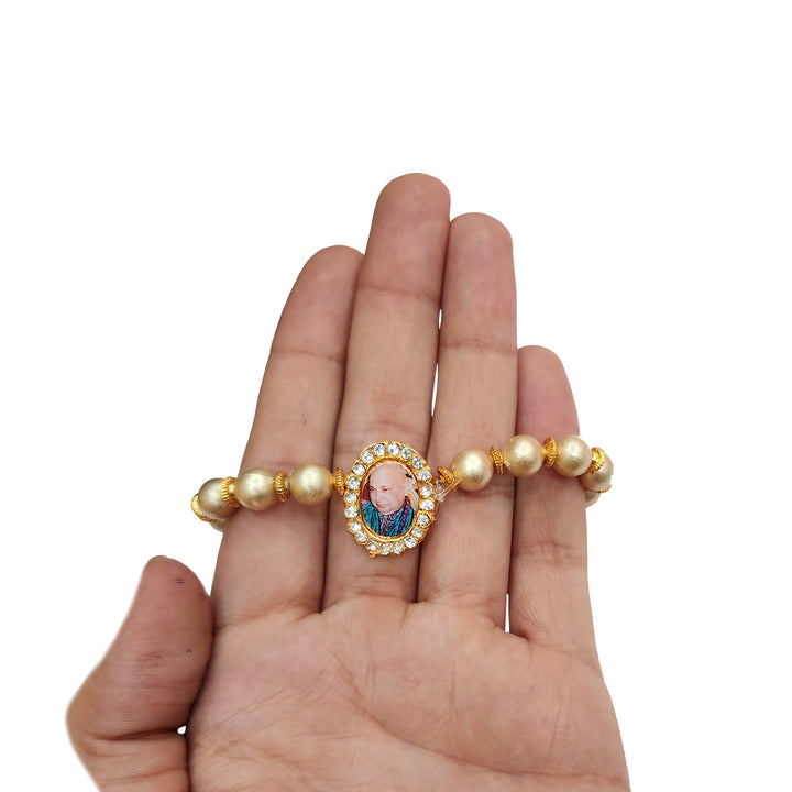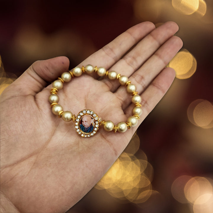 Our Guruji bracelet is a tangible symbol of divine connection. Crafted with care and reverence, it is designed to be worn close to your heart, serving as a constant reminder of Guruji's presence. The bracelet is adorned with sacred symbols and gemstones that hold spiritual significance, channeling positive energy and protection.