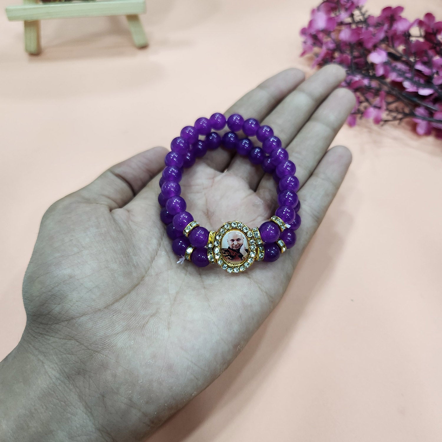 • Item Name: Purple Double Band Round Pearl Bracelet with Jai Guruji Swaroop Handmade Bracelets for Men and Women