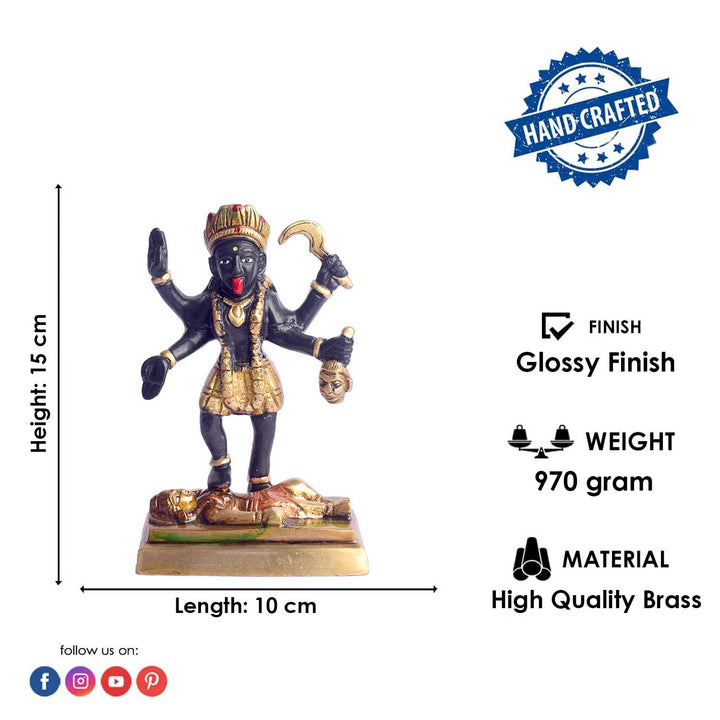 About Product: The 5.9 inch Brass Kali Mata Sculpture is a powerful and intricately crafted statue of Goddess Kali, representing her fierce and protective nature. Made from high-quality brass, this sculpture captures the goddess in her dynamic and divine form, with multiple arms holding symbolic weapons, and a fearless expression that embodies her role as the destroyer of evil. The fine detailing and golden shine add depth to her powerful presence, making it an exceptional addition to any home or temple. At 5.9 inches, this Kali Mata sculpture brings a sense of strength, protection, and spiritual energy to your space.