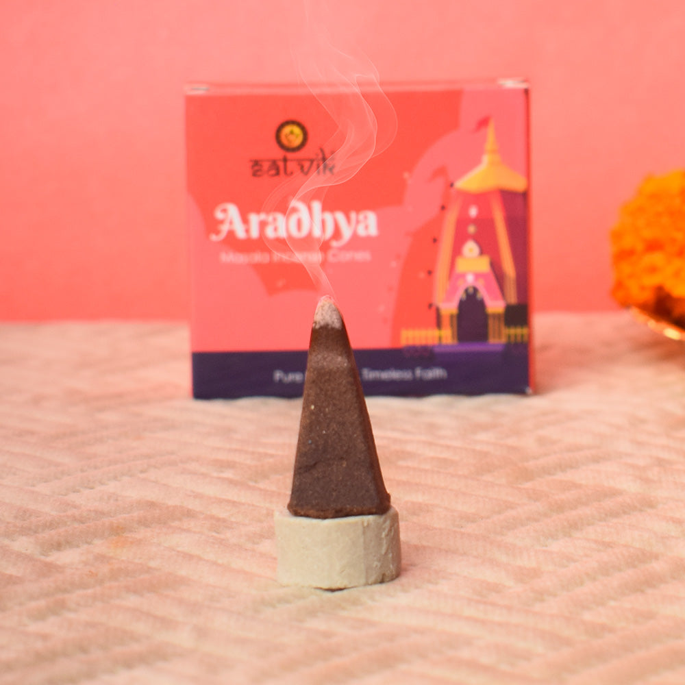 The word Aradhya means "worthy of worship," and these cones embody that essence by creating a serene atmosphere where the mind, body, and soul align with spiritual energy. Burning these incense cones symbolizes devotion and is an offering to the divine.