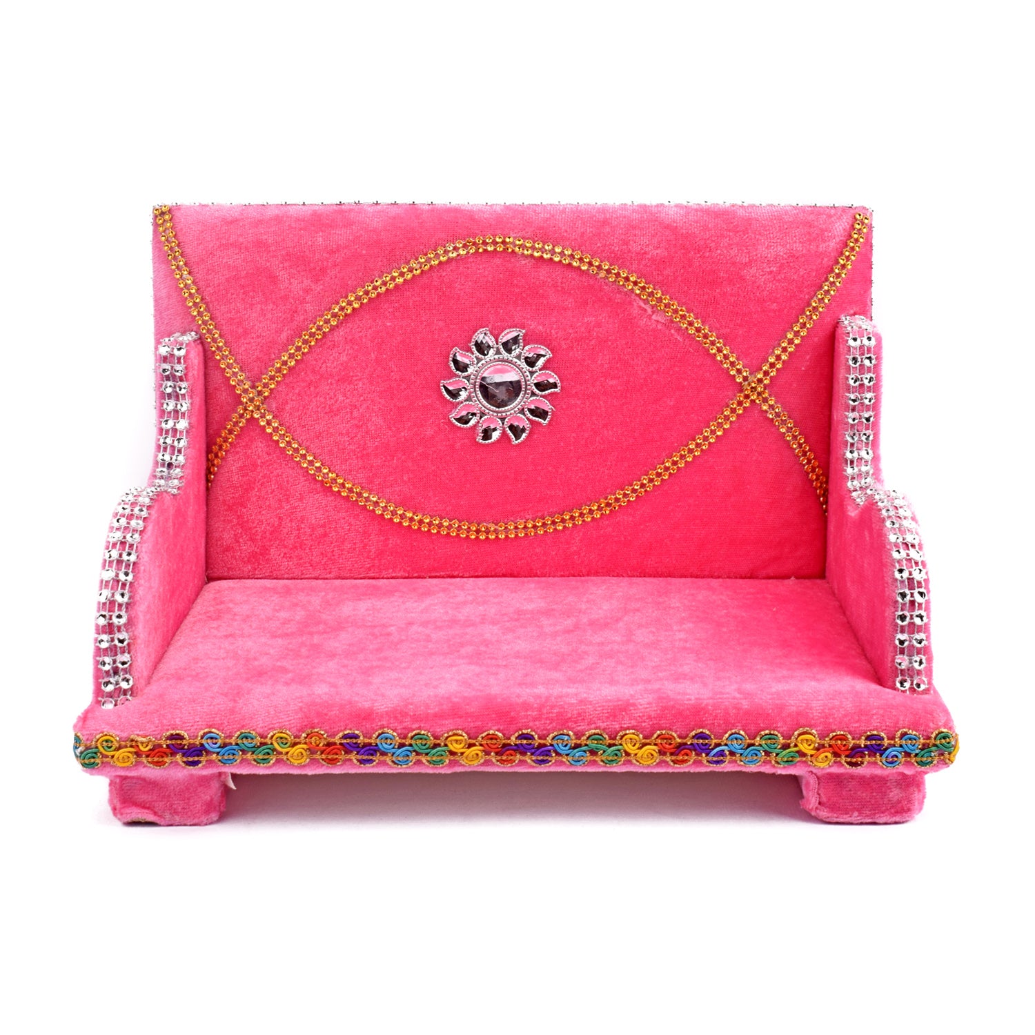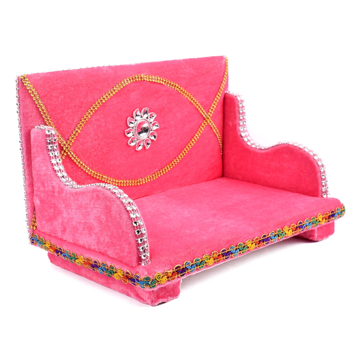 As you place your Laddu Gopal on this sacred throne, watch as the velvet embraces the little lord, showering blessings and grace upon your home. Its charming allure and captivating design make it a true centerpiece of devotion, adding a touch of splendor to your worship space.