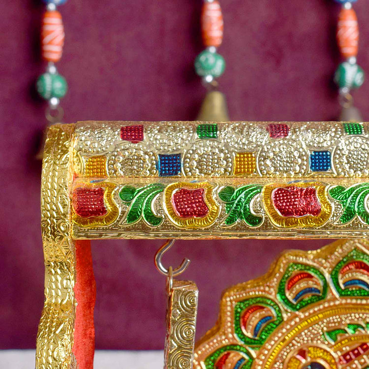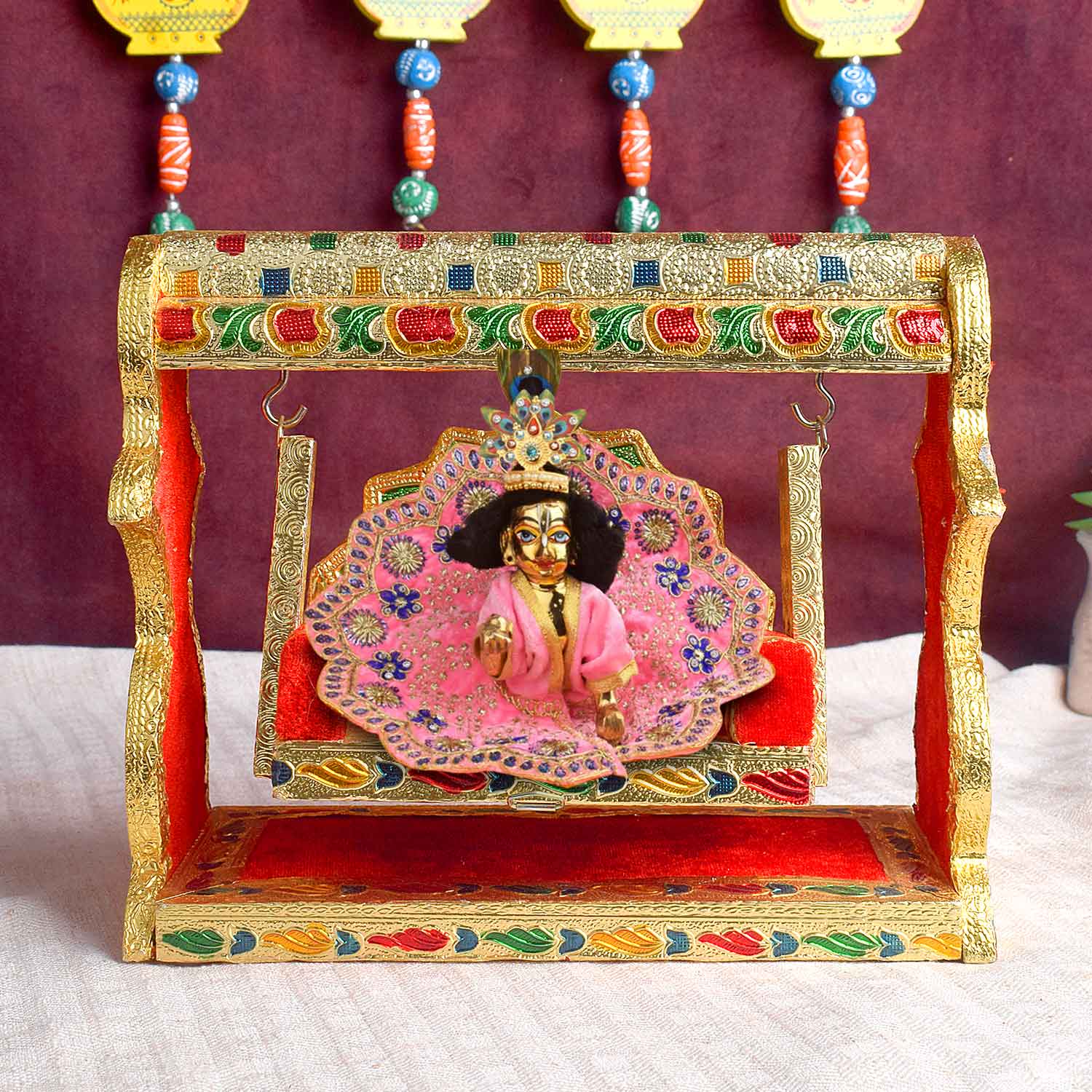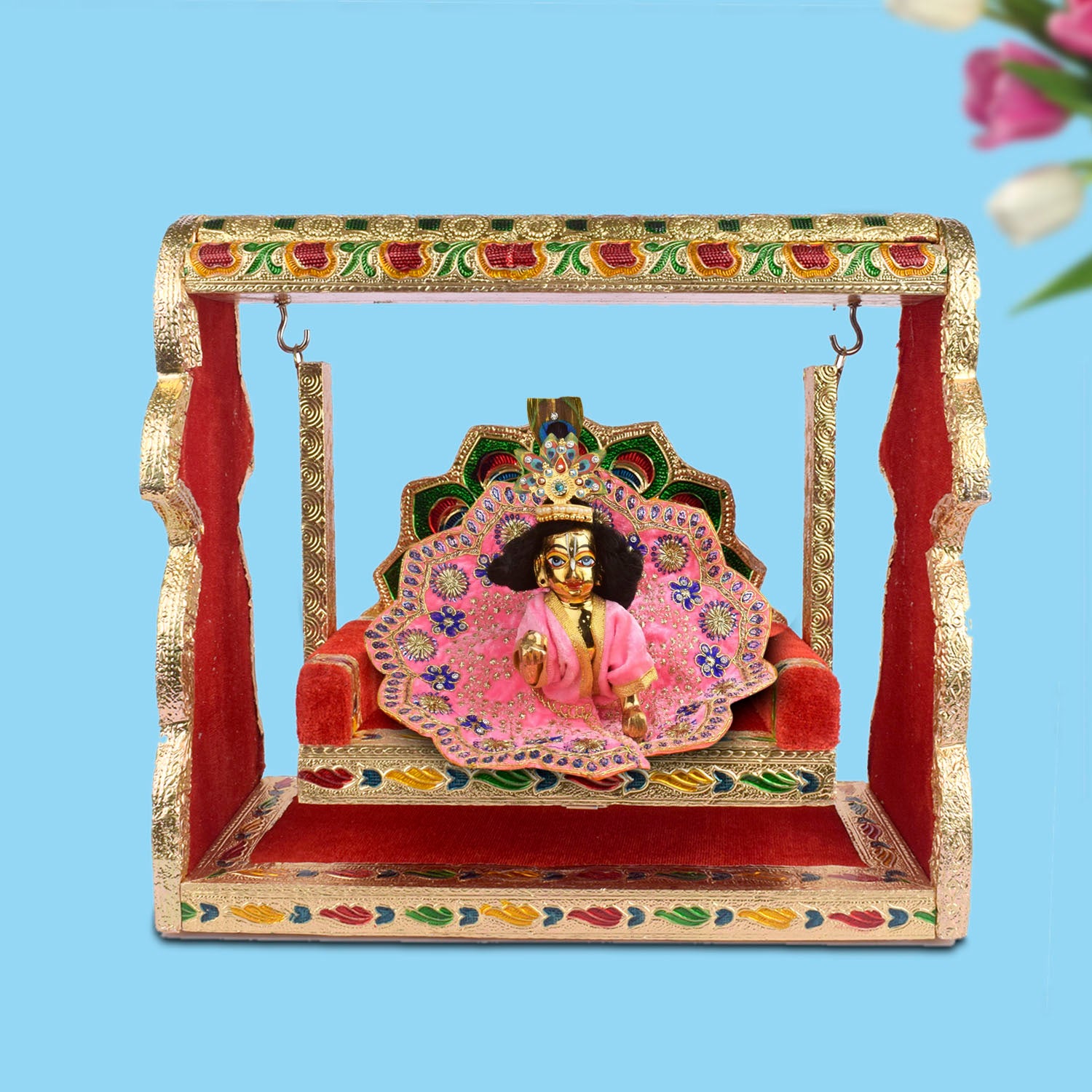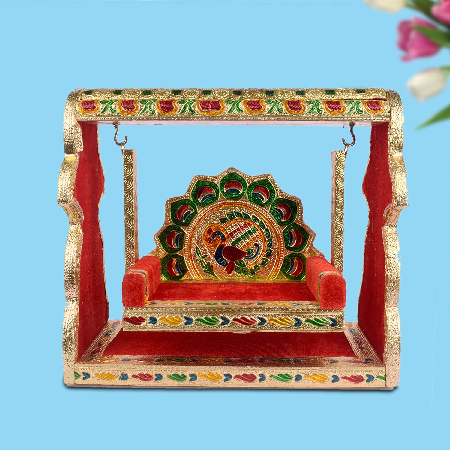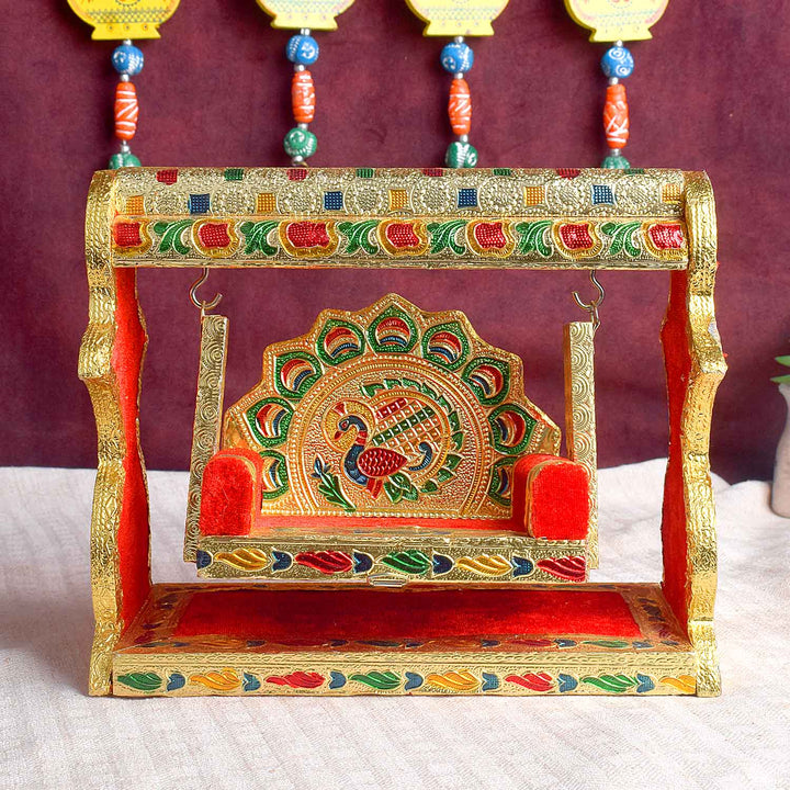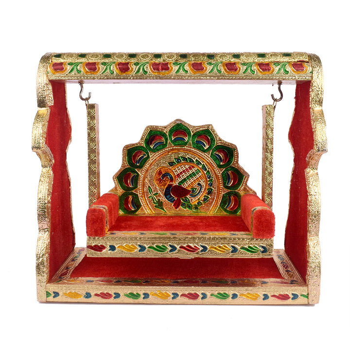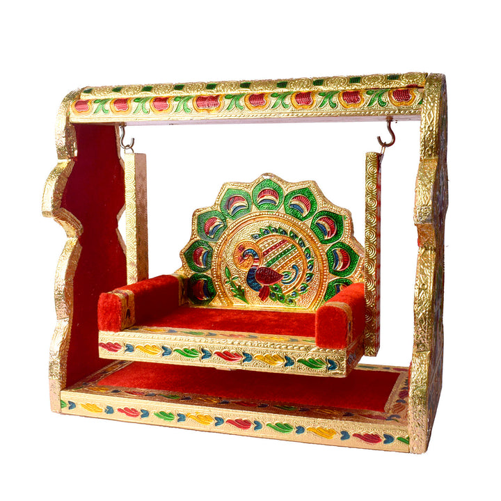 meenakari jhula | laddu gopal singhasan swing | velvet cradle jhula | broad frame jhula | peacock design pooja jhula | krishna swing seat | enamel laddu gopal jhula | ornate cradle swing | pooja accessories | laddu gopal throne | kanha ji jhula | temple decor | janmashtami jhula | spiritual gift | singhasan pooja item | golden jhula