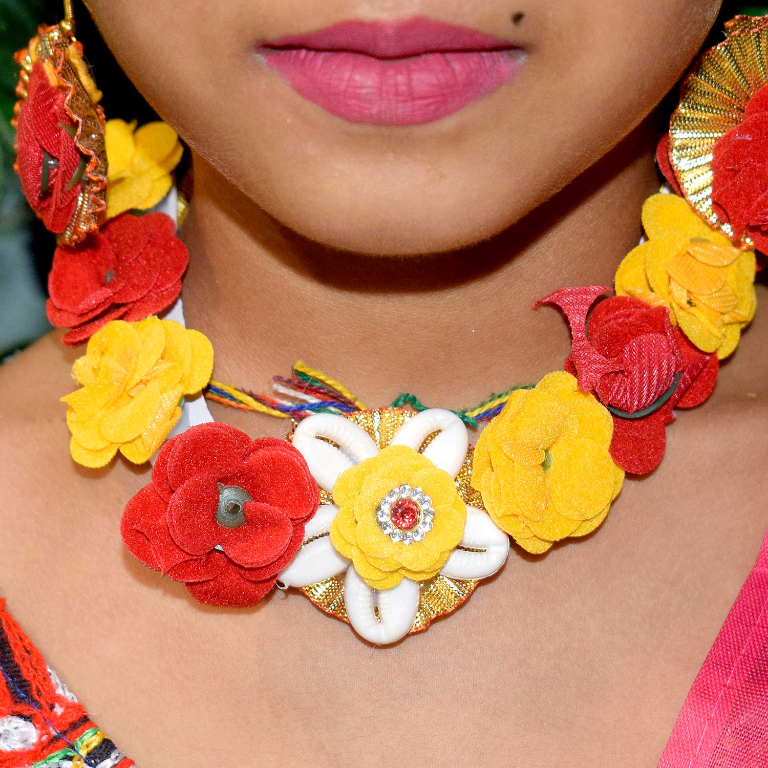 Radha Shringaar Set | Radha Flower Jewellery | Floral Maang Tikka Necklace | Yellow Red Flower Set | Janmashtami Jewellery for Girls | Radha Costume Accessories | Indian Traditional Kids Jewellery | Pooja Festive Set | Vrindavan Style Shringaar | Kids Floral Accessories