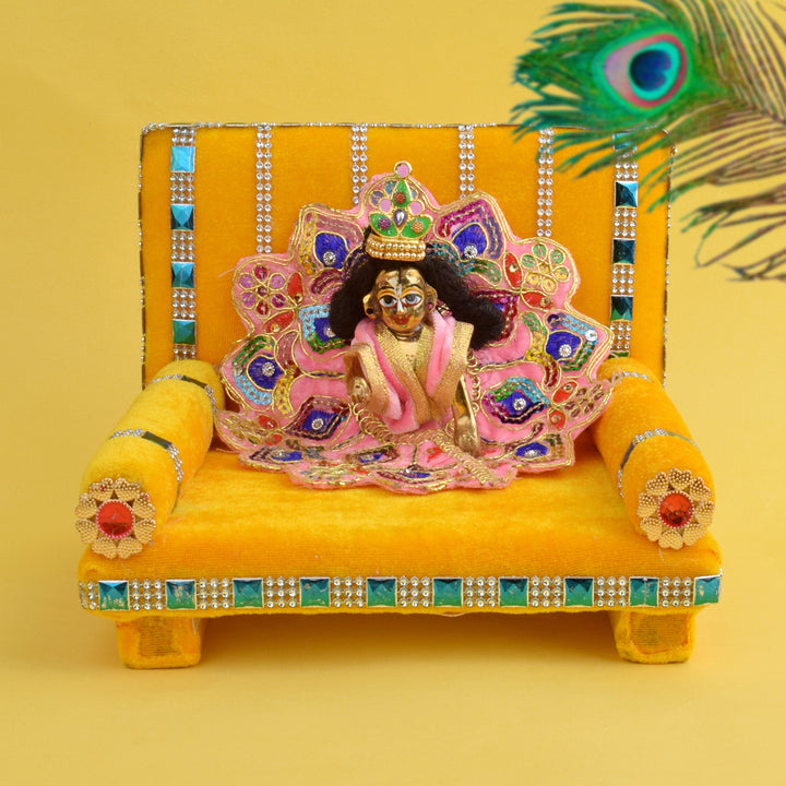 As you place your Laddu Gopal on this sacred throne, watch as the velvet embraces the little lord, showering blessings and grace upon your home. Its charming allure and captivating design make it a true centerpiece of devotion, adding a touch of splendor to your worship space.