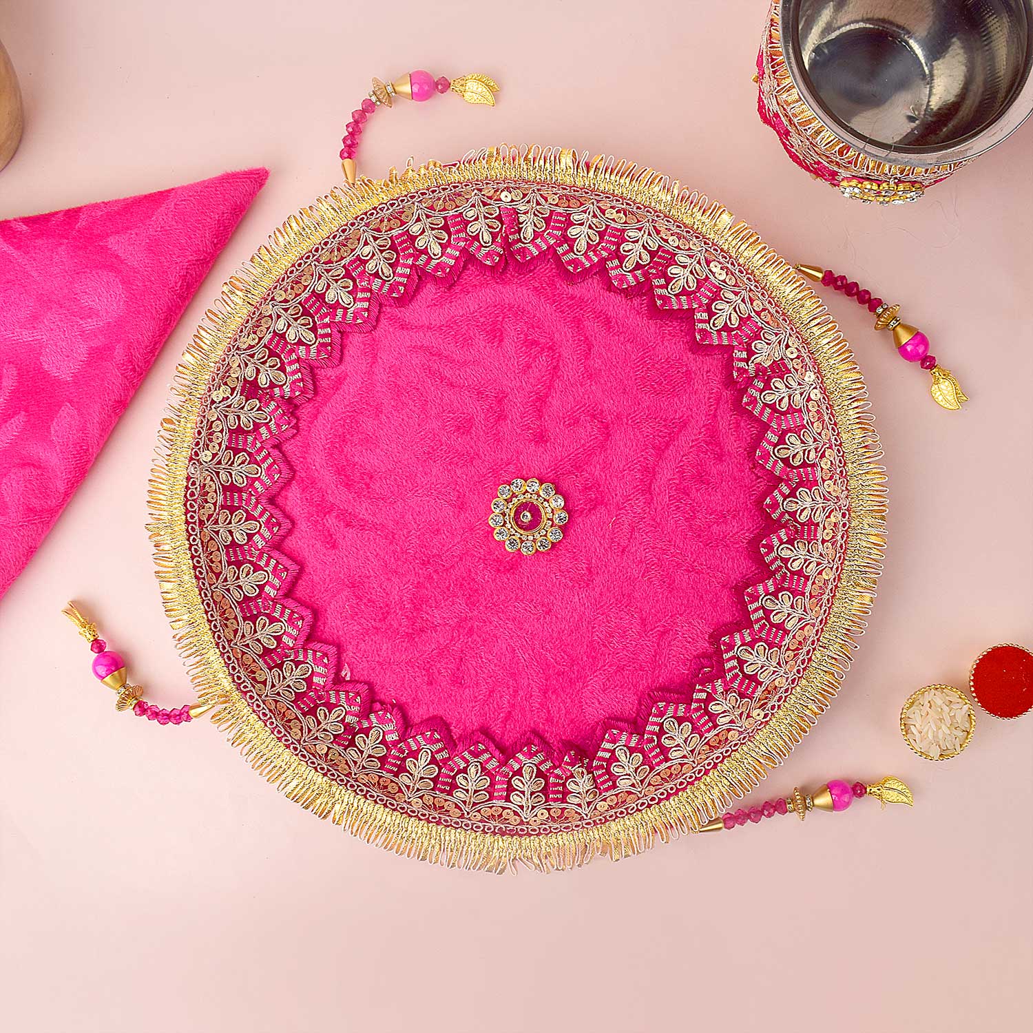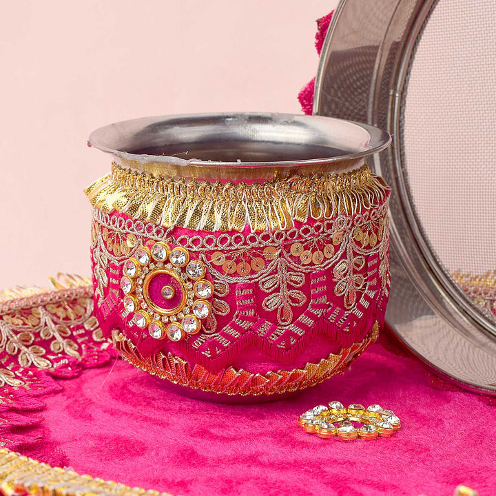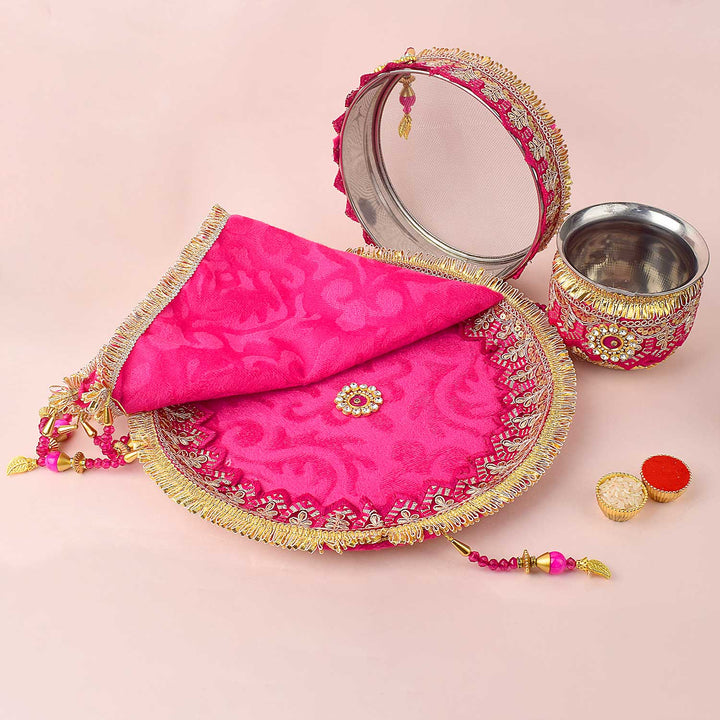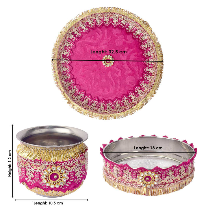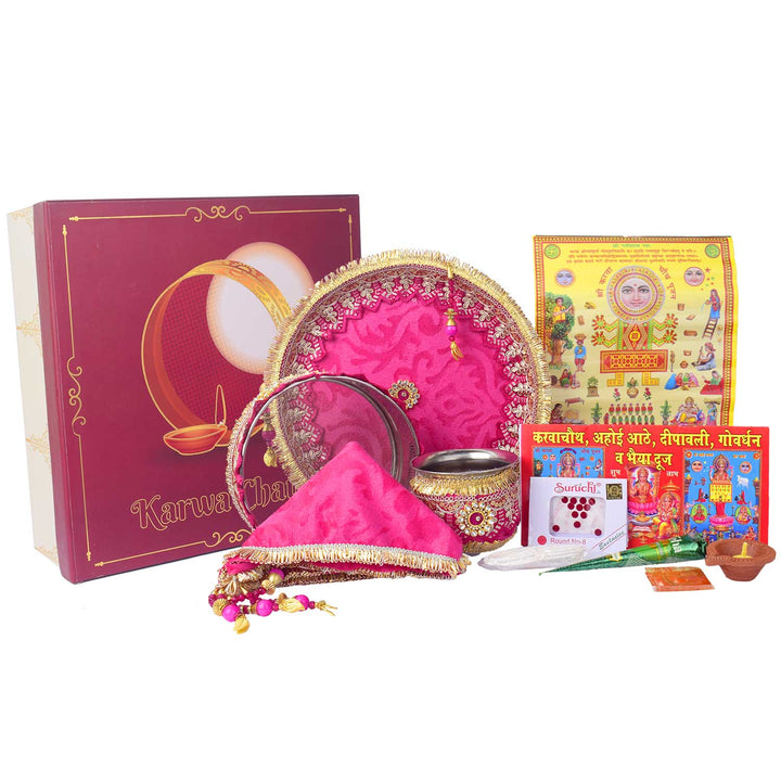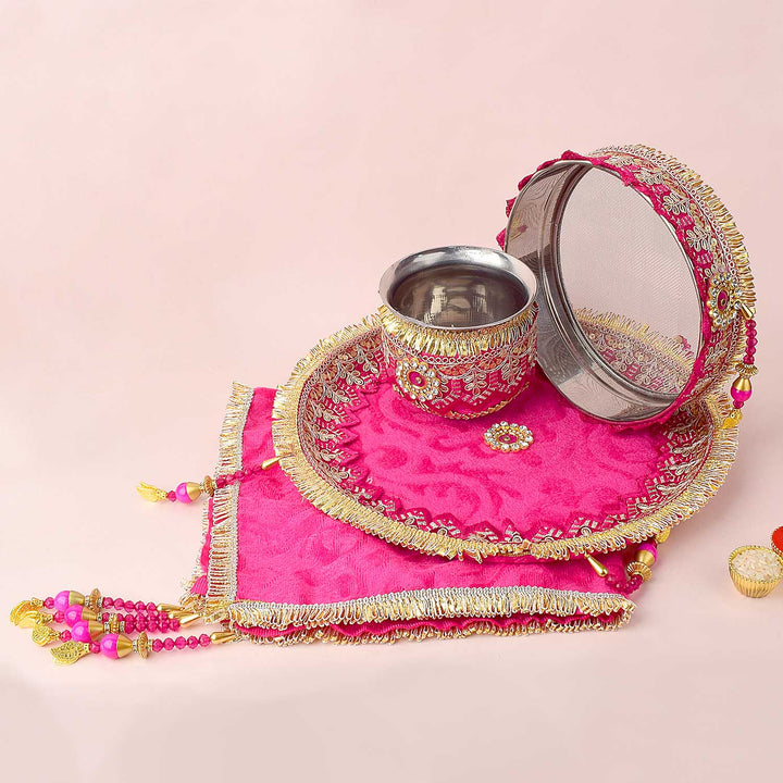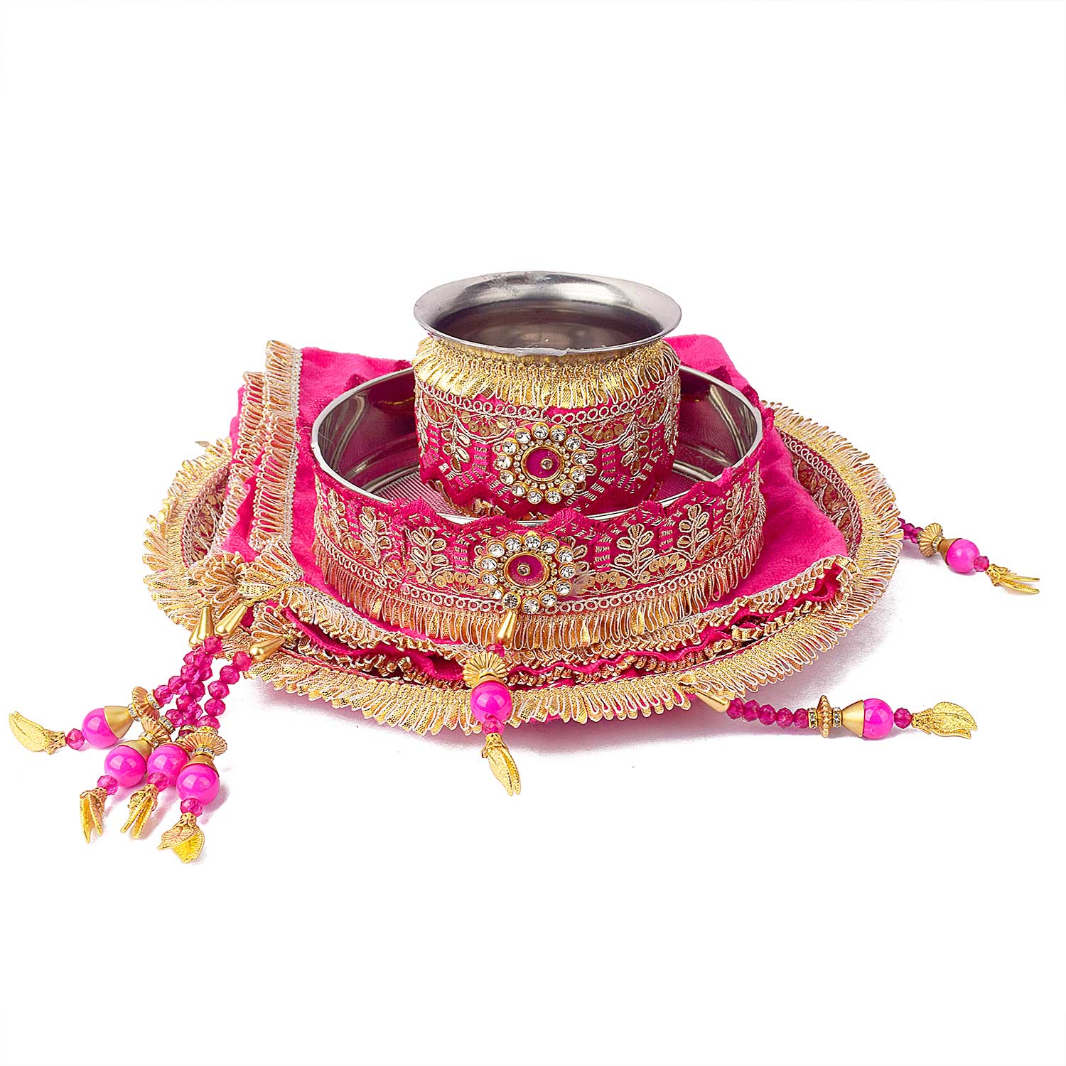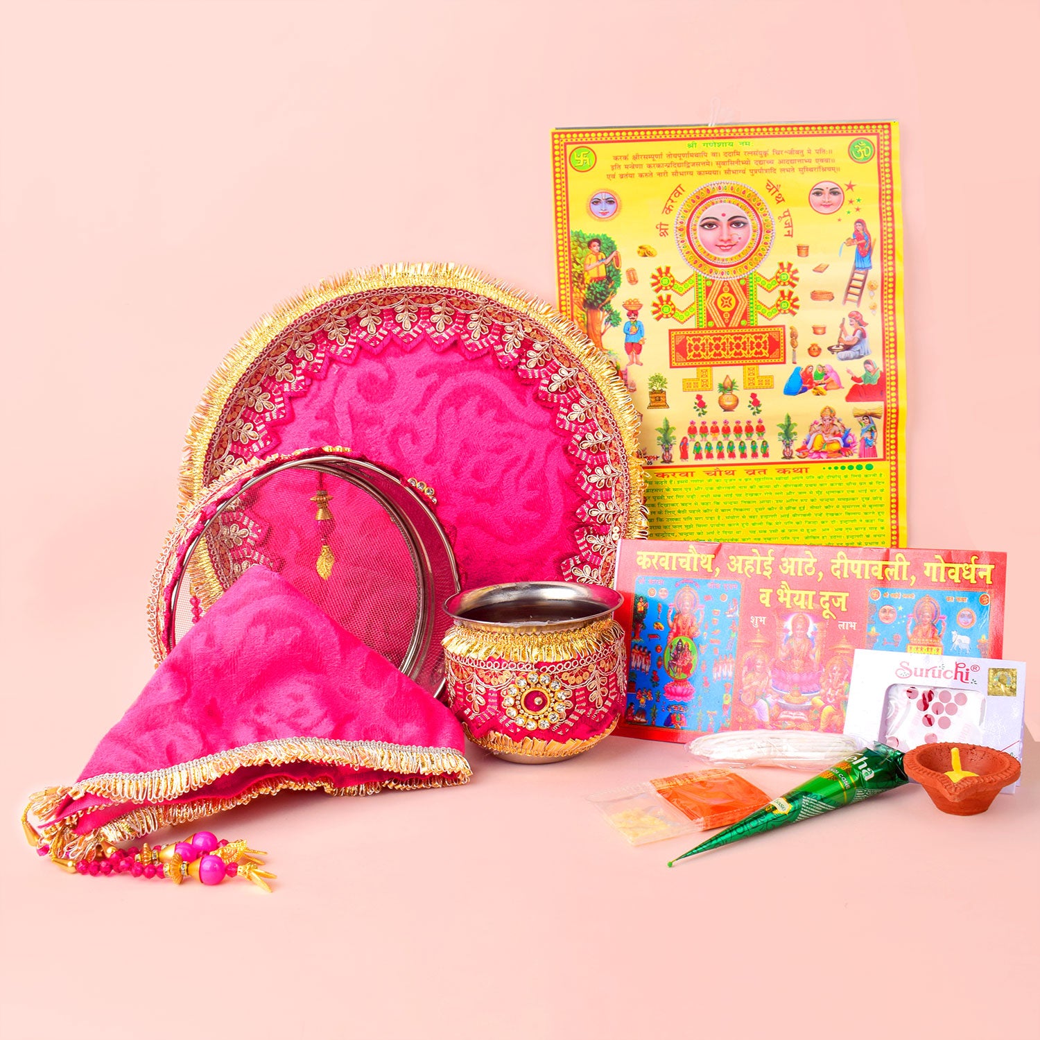 Buy Pink Embroidery Karwa Chauth Thali Set 11 Pc Kit | Satvikstore.in – satvikstore.in